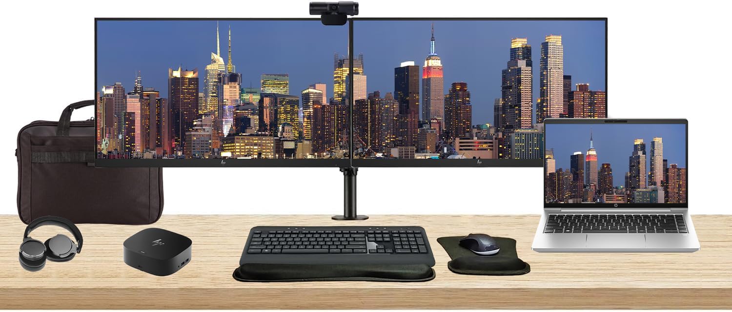 This comprehensive HP ProBook 445 G10 bundle is designed to enhance your productivity. It includes a 14" laptop powered by a Ryzen 5 processor, 16GB of RAM, and a 256GB SSD. The bundle also features two 24” EliteDisplay monitors, a dual monitor stand, a USB-C dock, a wireless keyboard and mouse, a webcam, headphones, and a bag, providing everything you need for a complete workstation setup.