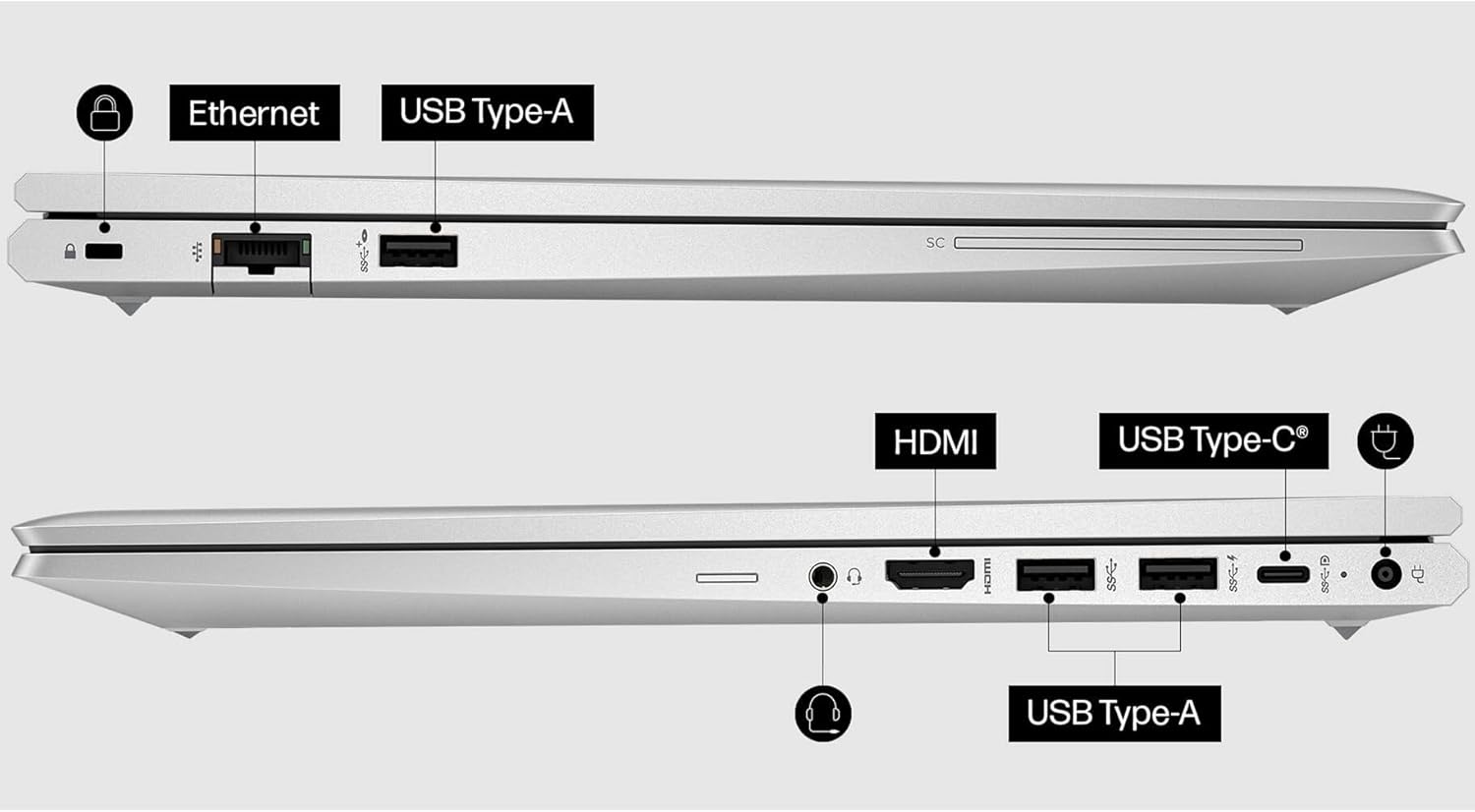 - Ports: 1 USB Type-C 10Gbps (USB Power Delivery, DisplayPort 1.4), 3 USB Type-A 5Gbps (USB Power Delivery), 1 AC power, 1 HDMI 2.1, 1 stereo headphone/microphone combo jack, 1 RJ-45