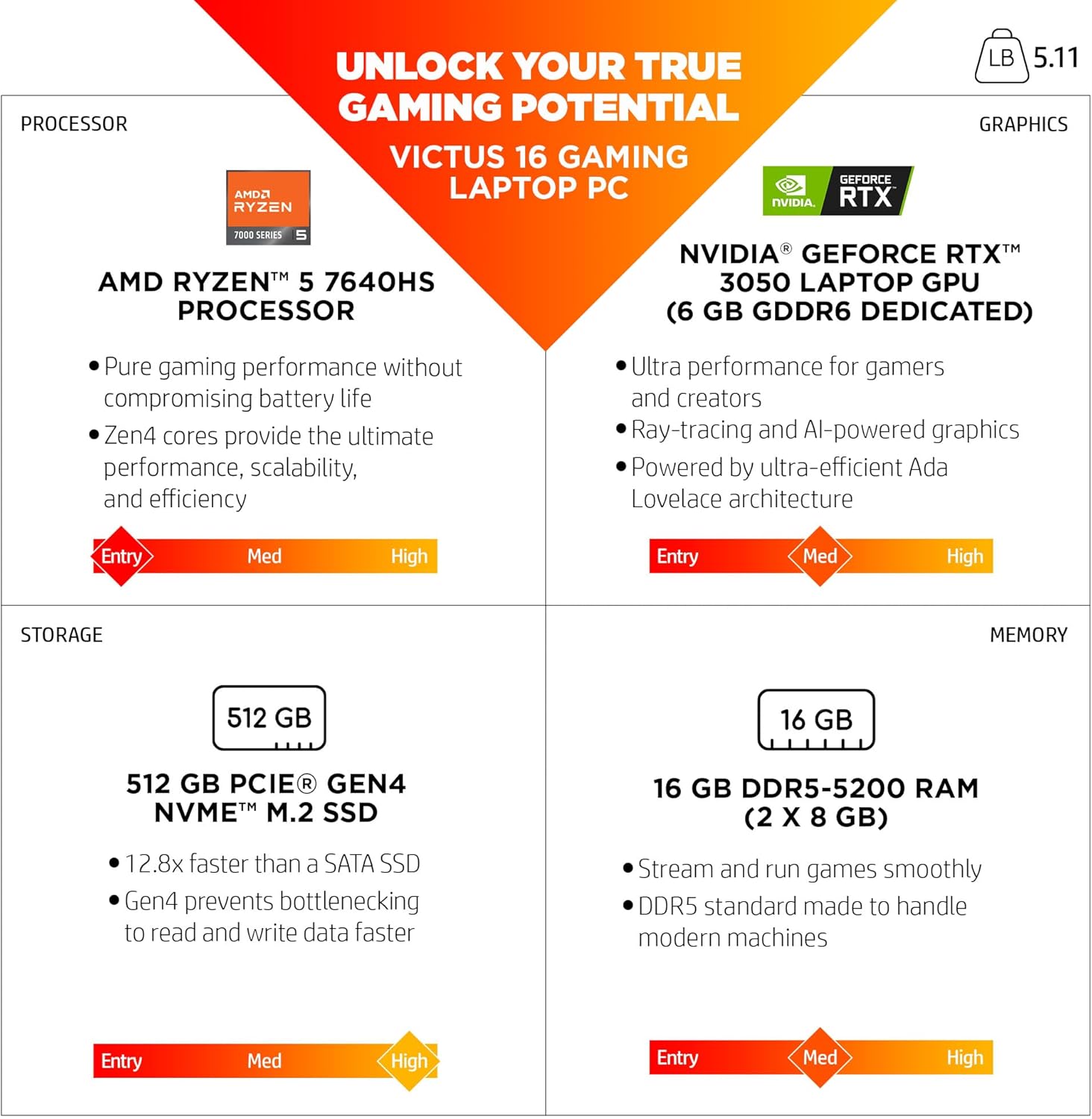 - Special Feature: AMD Ryzen 5 7640HS (up to 5.0 GHz max boost clock, 16 MB L3 cache, 6 cores, 12 threads), 1 USB Type-A 5Gbps signaling rate (HP Sleep and Charge); 1 USB Type-C 5Gbps signaling rate (USB Power Delivery, DisplayPort 1.4a, HP Sleep and Charge); 2 USB Type-A 5Gbps signaling rate; 1 HDMI 2.1; 1 RJ-45; 1 AC smart pin; 1 headphone/microphone combo, 16.1" diagonal, FHD (1920 x 1080), 144 Hz, IPS, micro-edge, anti-glare, 250 nits, 45% NTSC, 16 GB DDR5-5600 MHz RAM (2 x 8 GB)