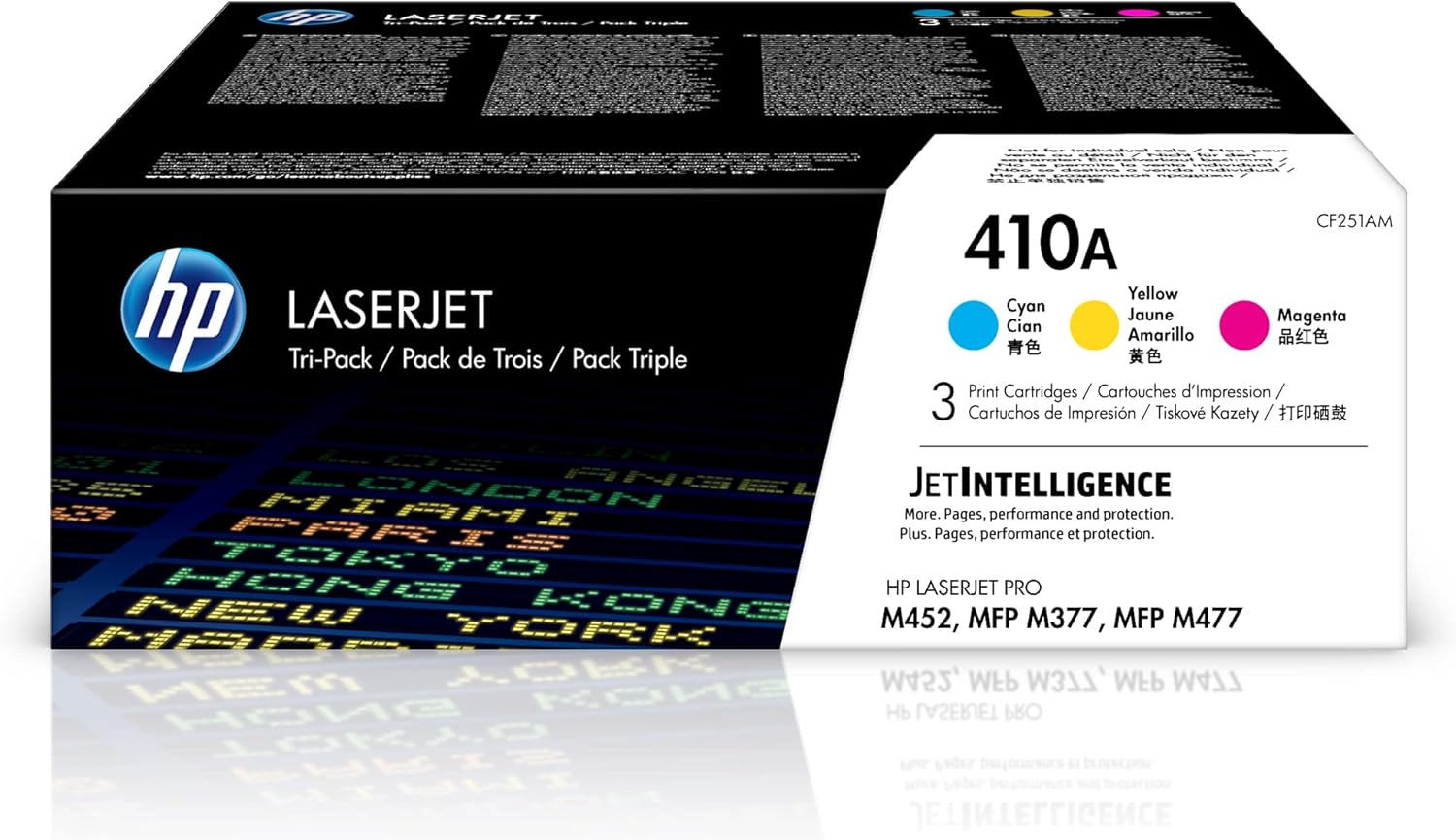 The HP 410A Cyan, Magenta, Yellow Toner Cartridges (3-pack) deliver consistent, high-quality color prints. Designed to work seamlessly with your HP Color LaserJet Pro printer, these cartridges ensure reliable performance and minimize printing problems. **Specifications:** * **Color:** Cyan, Magenta, Yellow * **Cartridge Yield (approx.):** 2,300 pages per color * **Compatibility:** HP Color LaserJet Pro M452 Series, Color LaserJet Pro MFP M377, M477 SeriesWe partner with Amazon and other retailers to provide accurate product information and convenient access to purchase options. As an Amazon Associate we earn from qualifying purchases.