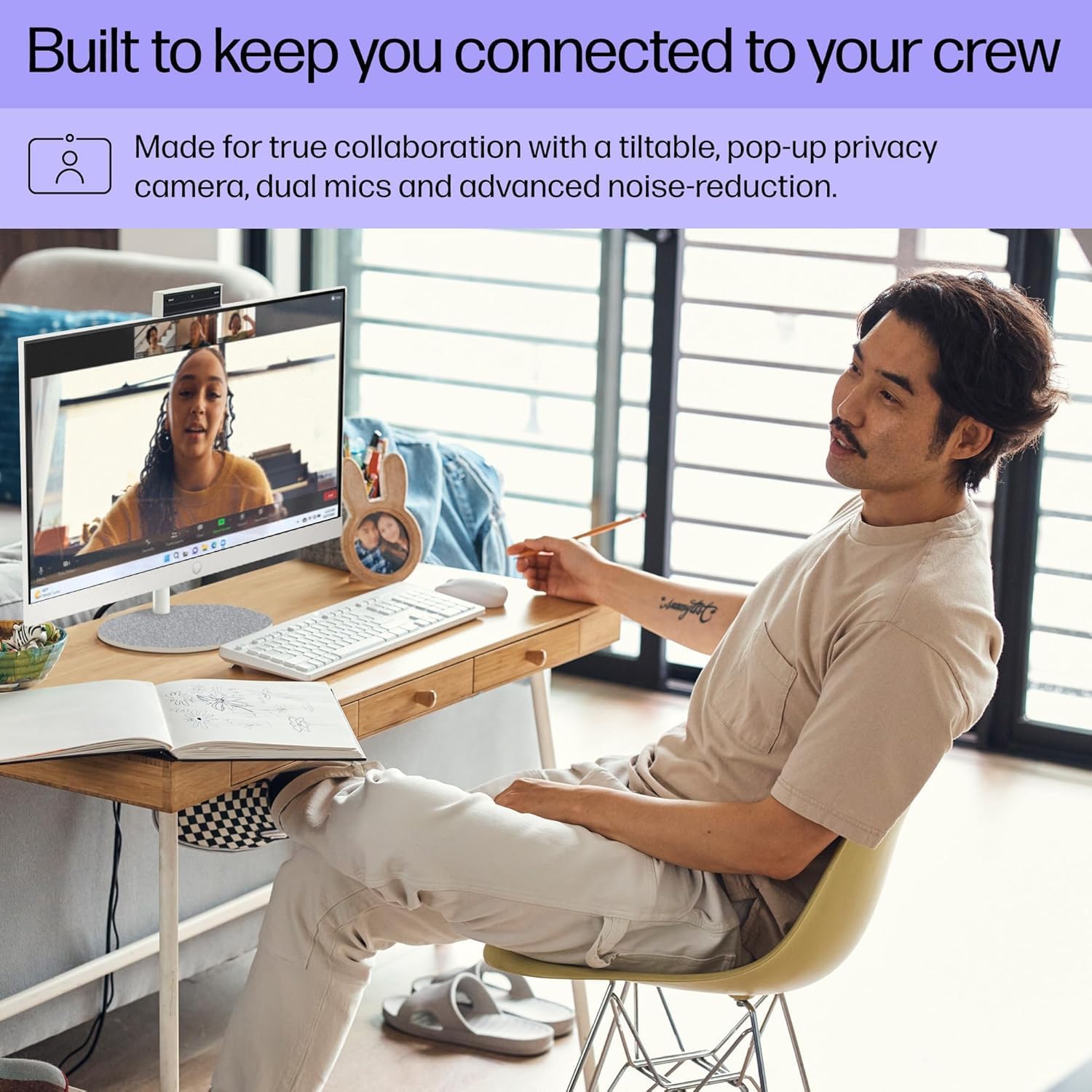 The HP 27-inch All-in-One Desktop PC combines performance and sustainability. Featuring a powerful Intel Core processor, ample memory, and fast SSD storage, it delivers seamless multitasking and enhanced productivity. Its sleek design integrates a vibrant FHD display and essential features for a clutter-free workspace.