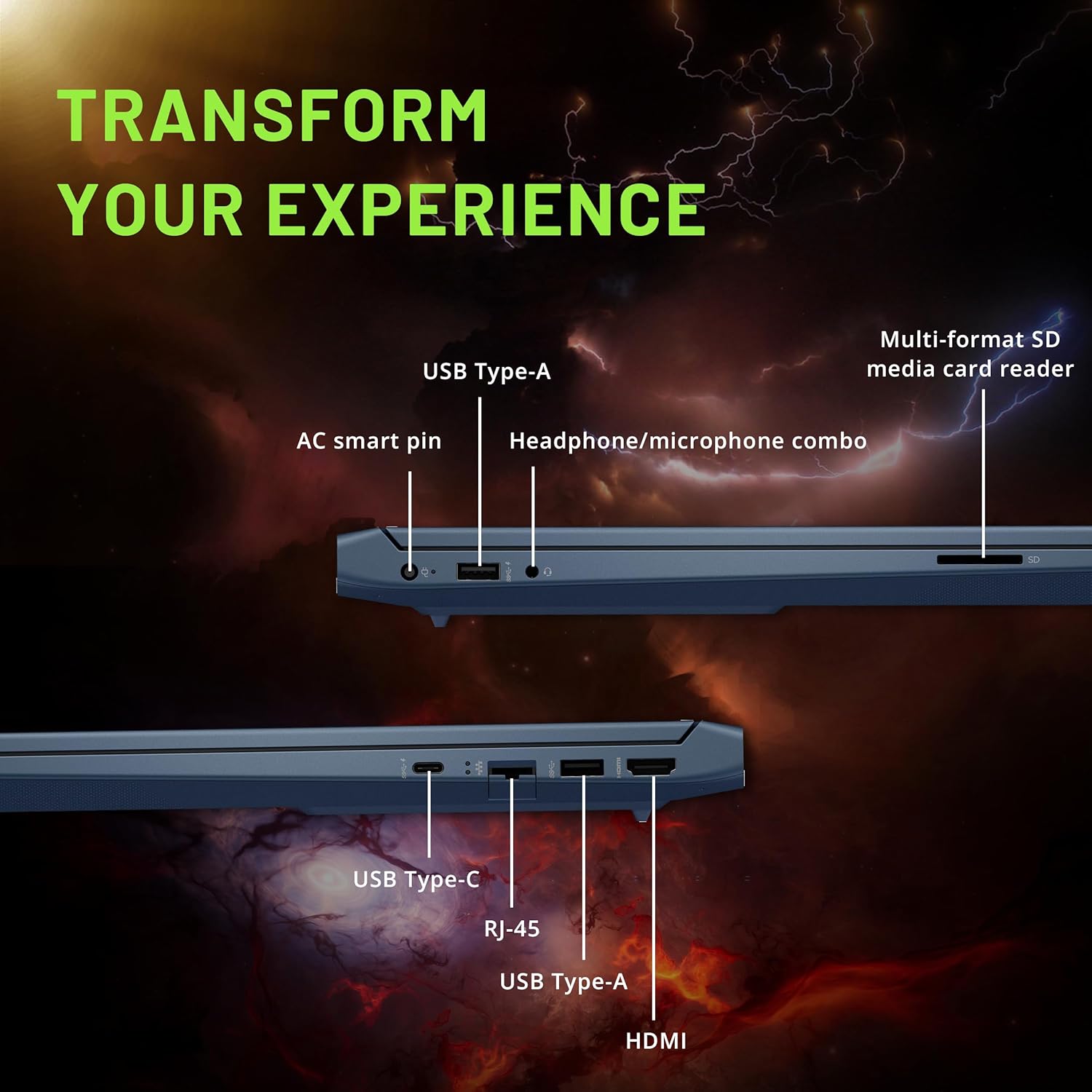 - Ports: 2x USB Type-A, 1x USB Type-C, 1x RJ-45, 1x Headset Port, 1x HDMI, 1x Read Card