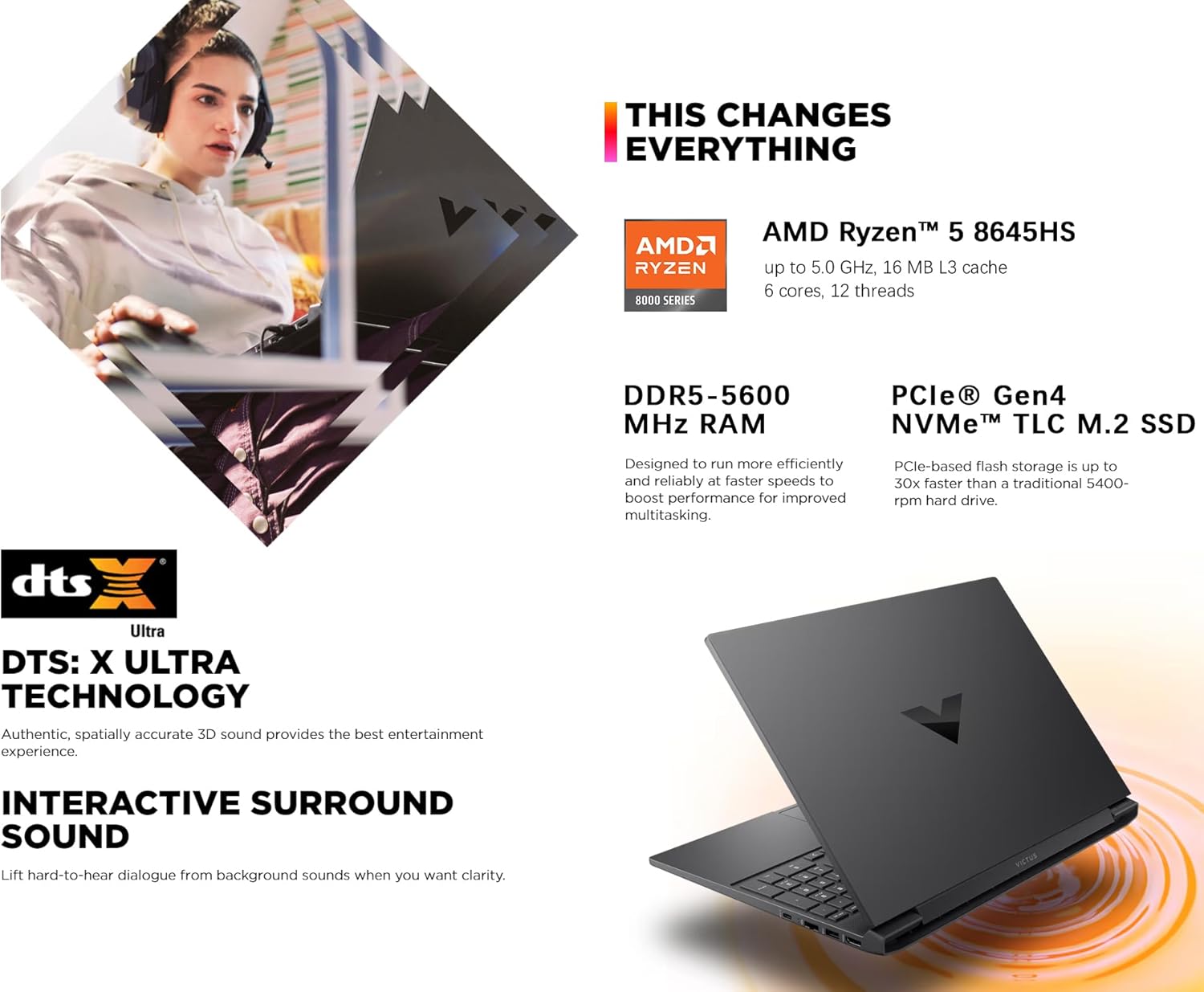 **Specifications:** * **Display:** 15.6-inch FHD (1920 x 1080), 144Hz refresh rate, IPS micro-edge anti-glare * **Graphics:** NVIDIA GeForce RTX 4050 Laptop GPU (6 GB GDDR6 dedicated) * **Processor:** AMD Ryzen 5 8645HS, 6 SMT-enabled Zen 4 cores (12 threads) running at 4.3 GHz to 5.0 GHz * **Operating System:** Windows 11 Home * **Memory:** 32GB DDR5 RAM dual-channel capable * **Storage:** 1TB PCIe4.0 SSD * **Connectivity:** Wi-Fi 6 and Bluetooth 5.3 wireless card * **Audio:** DTS X Ultrasound * **Keyboard:** Backlit keyboard * **Camera:** HD camera with Temporal Noise Reduction * **Ports:** 2 x SuperSpeed USB Type-A, 1 x SuperSpeed USB Type-C, 1 x HDMI 2.1, 1 x RJ-45, 1 x headphone/microphone combo * **Battery:** Up to 11 hours video playback * **Features:** AMD FreeSync Premium TechnologyWe partner with Amazon and other retailers to provide accurate product information and convenient access to purchase options. As an Amazon Associate we earn from qualifying purchases.