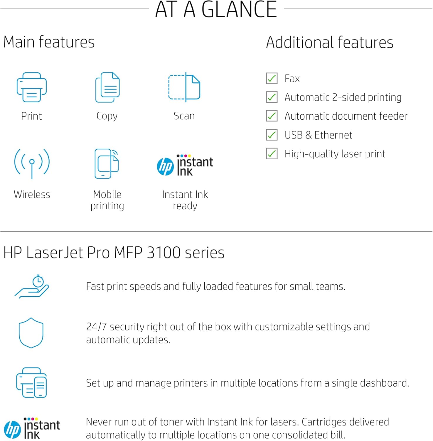 The HP LaserJet Pro MFP 3101fdw is a renewed wireless black & white printer, offering efficient printing, scanning, copying, and faxing capabilities in a compact design. Ideal for home or small office environments where reliability and multifunctionality are key.