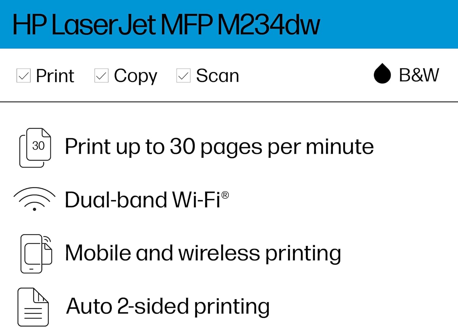**Specifications:** * **Brand:** HP * **Model:** M234dw (6GW99F#BGJ) * **Functions:** Print, Scan, Copy * **Print Speed (Black & White):** Up to 30 ppm (single-sided), Up to 19 ppm (two-sided) * **Print Resolution:** 600 x 600 dpi * **Connectivity:** Wi-Fi, Ethernet, USB 2.0 * **Mobile Printing:** HP Smart App, AirPrint, Microsoft, Mac, Android, ChromebookWe partner with Amazon and other retailers to provide accurate product information and convenient access to purchase options. As an Amazon Associate we earn from qualifying purchases.