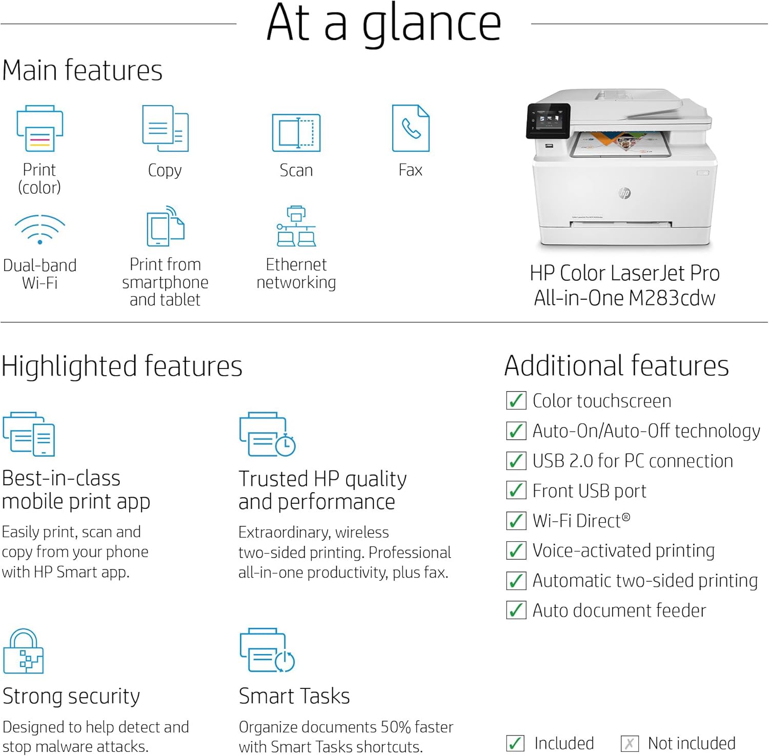 The HP LaserJet Pro MFP M283 cdw is designed for demanding workplaces, offering printing, scanning, copying, and faxing functions. It has wireless capabilities to fulfill your business and imaging needs.