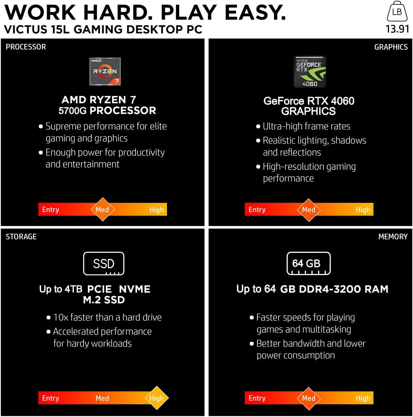 Introducing the HP Victus 15L Premium Gaming Desktop. Equipped with an AMD Ryzen processor, NVIDIA GeForce RTX graphics, and ample memory and storage, this desktop delivers exceptional gaming performance.