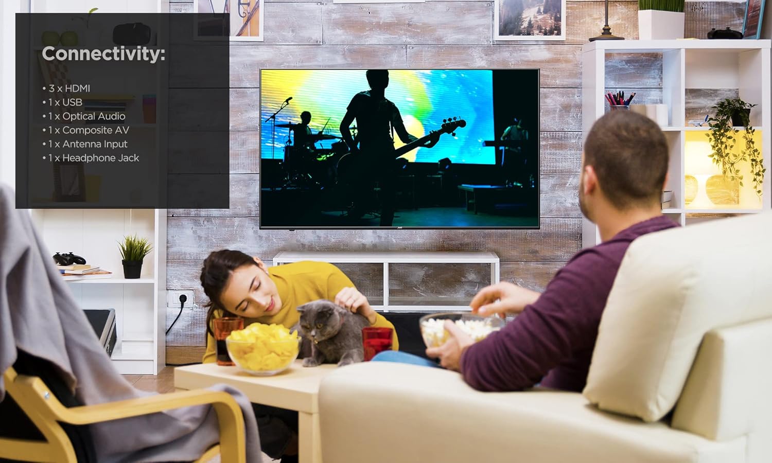 - Connectivity: Dual-Band Wi-Fi, 3x HDMI, 1x USB, 1x Optical Audio, 1x Composite AV, 1x Antenna Input, 1x Headphone Jack
