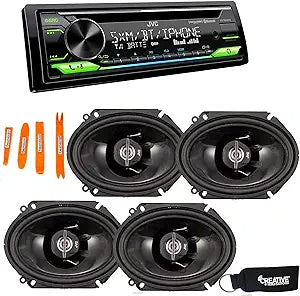 This JVC bundle includes the KD-T910BTS CD Receiver and two pairs of JVC CSJ6820 6x8" Speakers. The KD-T910BTS features Bluetooth, front USB, AUX, Amazon Alexa compatibility, and SiriusXM readiness, providing versatile connectivity options. The included speakers enhance your car audio with clear and powerful sound.