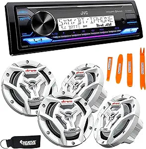The JVC KD-X38MBS Marine Digital Receiver combines Bluetooth connectivity, USB playback, and SiriusXM readiness. This setup includes a pair of JVC Marine Speakers delivering crisp audio with robust construction for marine conditions.