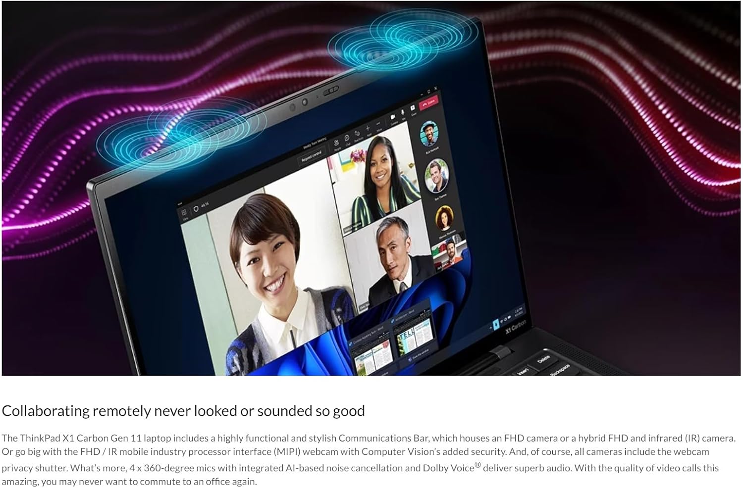 The Lenovo Gen 11 ThinkPad X1 Carbon Laptop combines premium performance with an ultrathin and ultralight form factor. Featuring an Intel Core i7 processor, ample RAM, and fast SSD storage, this laptop is designed for productivity on the go.
