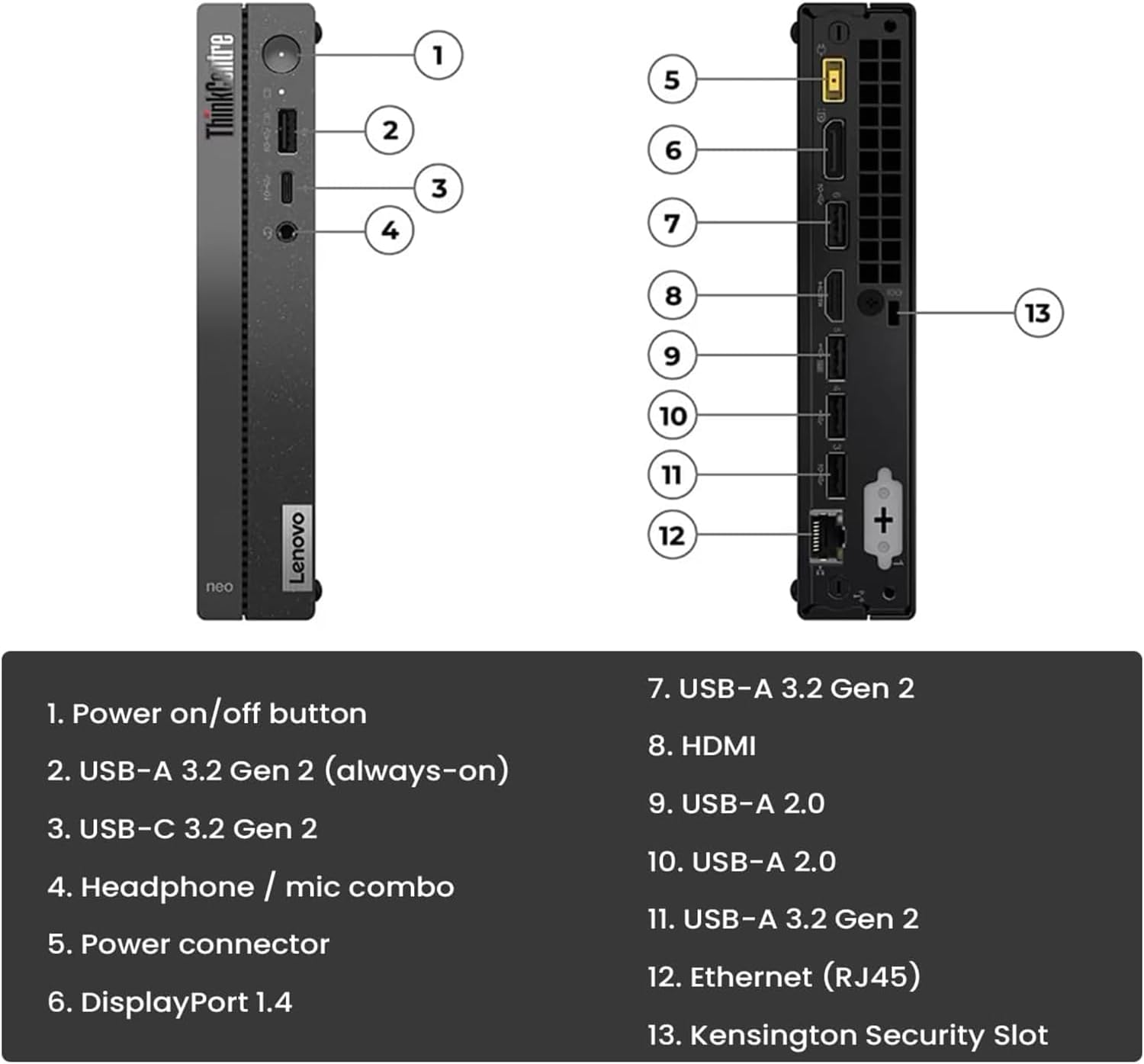 The Lenovo ThinkCentre neo 50q Gen 4 Tiny is a compact and efficient mini desktop computer designed for modern business environments. Equipped with a 13th Gen Intel Core i5 processor, ample memory, and fast SSD storage, this mini PC delivers robust performance in a small form factor.