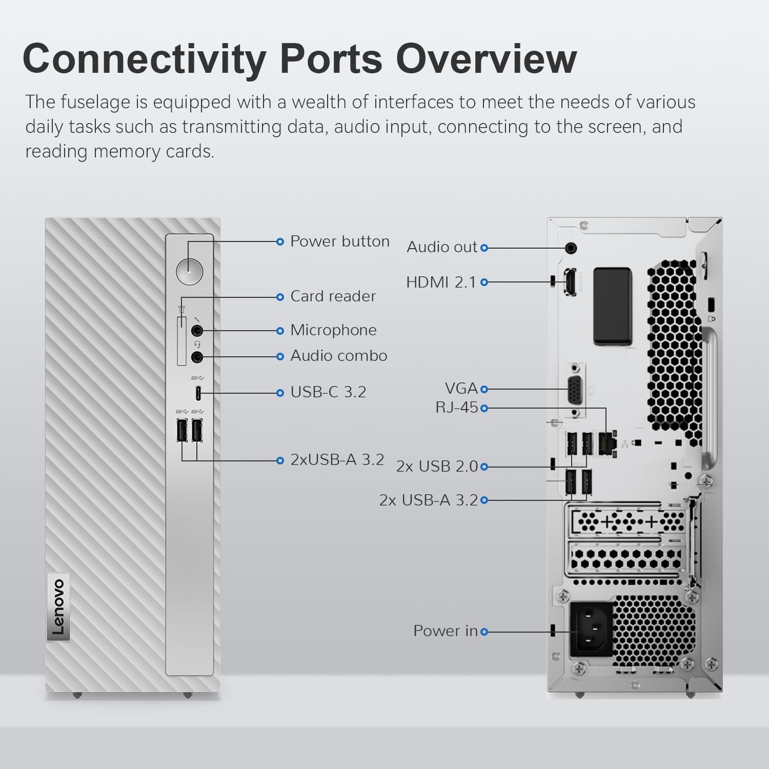 - Rear Ports: 1 x Audio Output, 1 x HDMI, 1 x VGA, 2 x USB-A 2.0, 2 x USB-A 3.2, 1 x RJ-45, 1 x Power