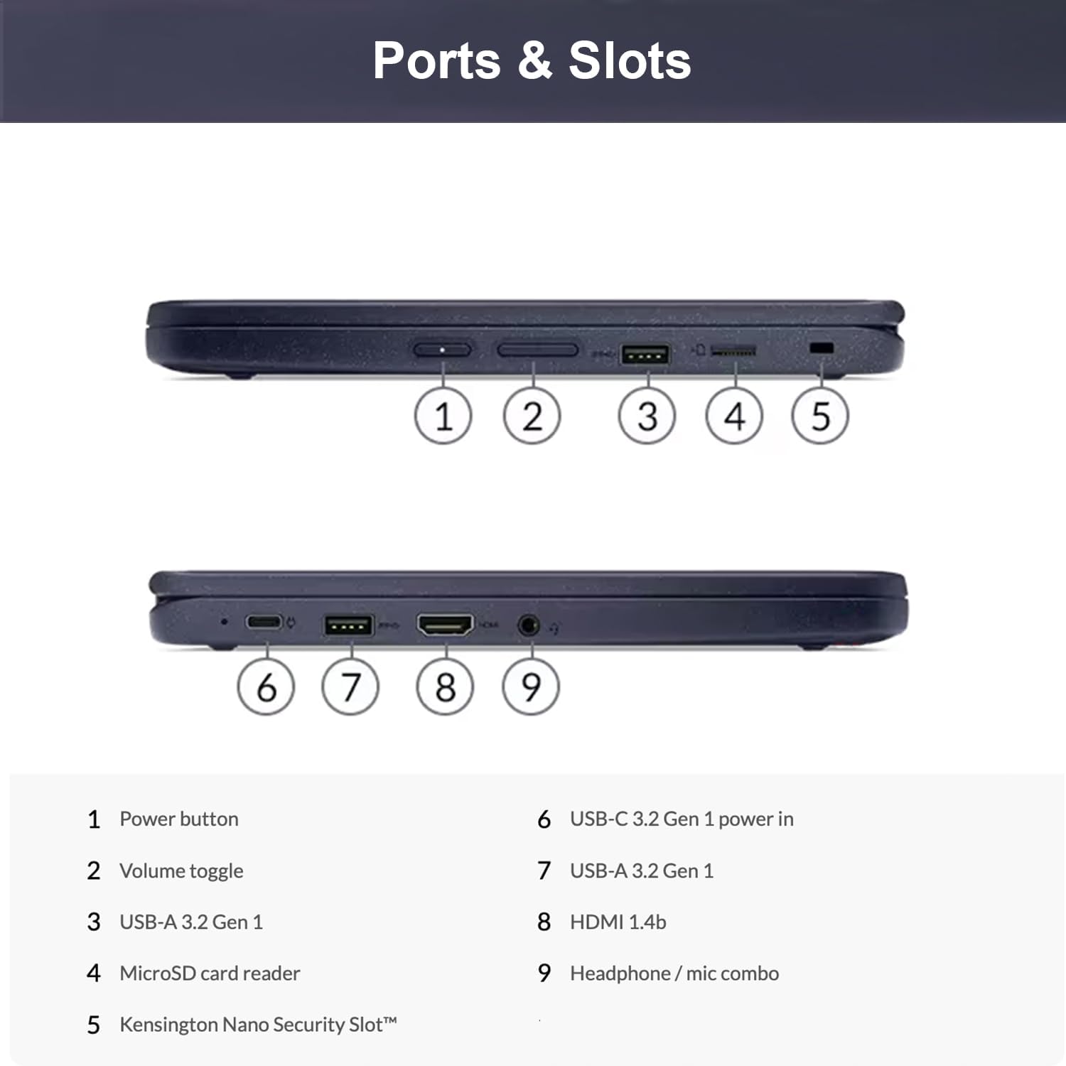 - Ports: USB-C 3.2 Gen 1, USB-A 3.2 Gen 1, HDMI 1.4b