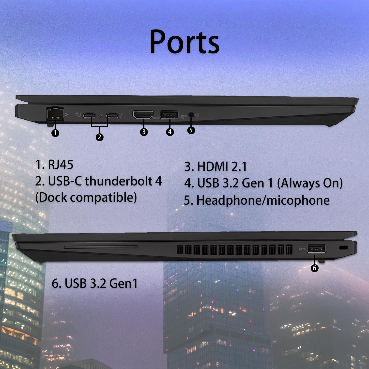 - Ports: 2x Thunderbolt 4, 2x USB 3.2 Gen 1, 1x HDMI 2.1, 1x Ethernet (RJ45), 1x Headphone/Microphone Combo Jack