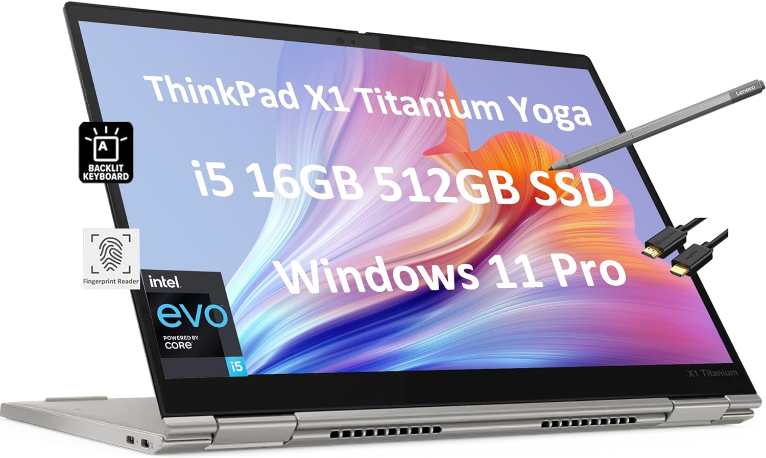 The Lenovo ThinkPad X1 Titanium Yoga is engineered for professionals on the move, seamlessly blending power and flexibility. This ultra-lightweight 2-in-1 laptop features a stunning 13.5" QHD touchscreen, Intel Core i5 processor, and the convenience of the Lenovo Precision Pen, all wrapped in a durable and sleek design. Enjoy the freedom to work or create in laptop, tent, stand, or tablet mode, backed by a 3-year warranty for peace of mind.