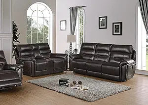 The Lexicon Lazarus Living Room Set offers classic design with modern features. This 2-piece set includes a sofa and loveseat, both featuring power reclining mechanisms, USB charging ports, and premium Italian top grain leather upholstery. The loveseat also includes a center storage console with cup holders.