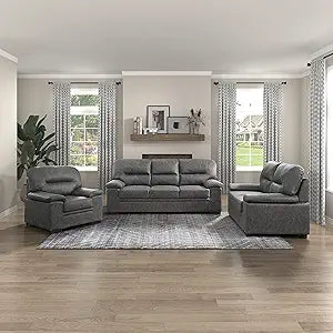 Elevate your living room decor with the Lexicon EOLA 3-Piece Living Room Set. This set includes a sofa, loveseat, and chair, all upholstered in a stylish dark gray microfiber. With its wooden frame and foam boxed pocket coil cushions, the EOLA collection offers both comfort and durability.