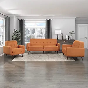 The Lexicon Jarboe 3-Piece Living Room Set offers a blend of mid-century modern design and comfortable functionality. This set, featuring a chair, loveseat, and sofa, is upholstered in a textured orange polyester fabric. The foam boxed pocket coil cushions ensure optimal support and comfort, making it an ideal addition to any living room.