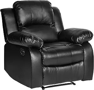 The Lexicon Baluze Recliner in Black offers a perfect blend of comfort and style. Upholstered in black faux leather and featuring a cushion back and pillow-top arms, this reclining chair provides a luxurious seating experience. Its pull-tab manual reclining system allows you to easily adjust to your preferred position, making it an ideal addition to any living space.