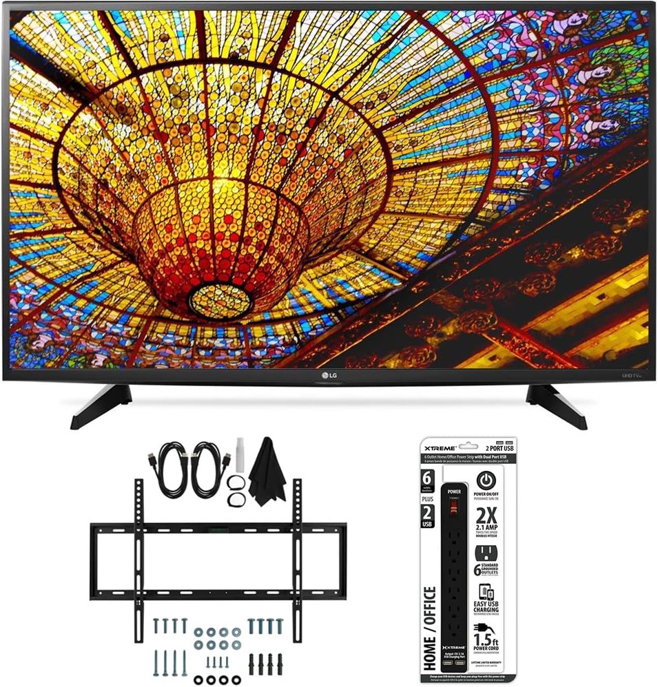 Experience stunning picture quality with the LG 43UH6100 43-Inch 4K UHD Smart TV with webOS 3.0. This bundle includes the TV, a slim flat wall mount ultimate kit, and a power strip with dual USB ports for convenient connectivity.
