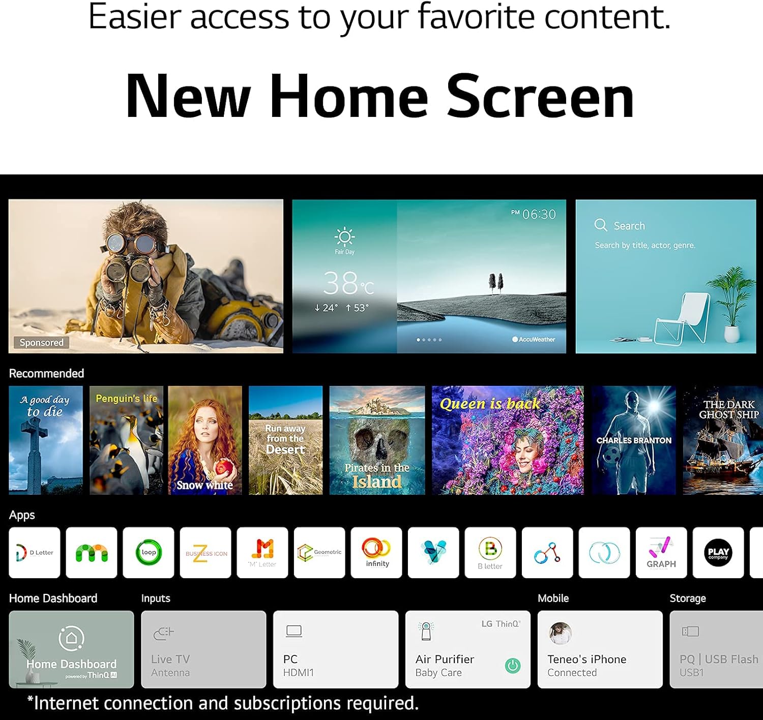 - Smart Features: LG App Store, Full Web Browser, LG Channels, Sports Alert, Gallery Mode, Who.Where.What, Home Dashboard, Multiple Voice Assistants, LG ThinQ AI, Magic Remote Control, Universal Remote Control, Intelligent Voice Recognition