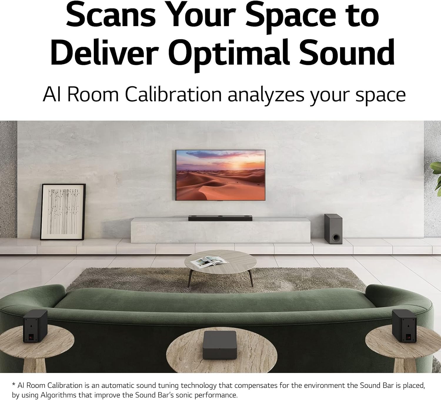 Introducing the LG S80QR 5.1.3ch Sound Bar, designed to elevate your home entertainment experience. This sound bar system delivers truly immersive 5.1.3 channel audio with Dolby Atmos and includes 4ch rear speakers and a subwoofer. The center up-firing speaker enhances voice clarity and surround effects.