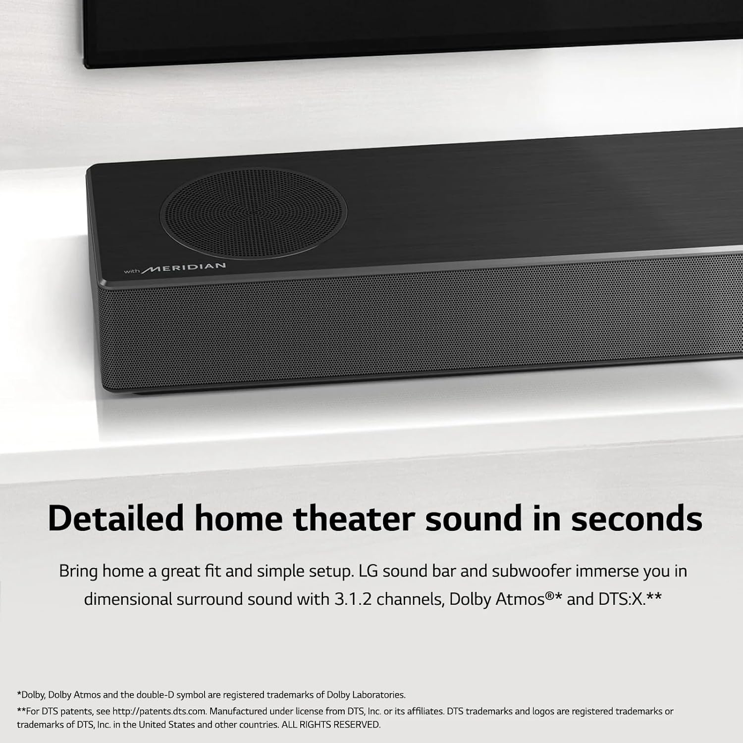 Bring the immersive audio experience of the cinema right into your living room with the LG SPM7A 3.1.2 Channel High Res Audio Sound Bar. With Dolby Atmos technology and sound tuned by Meridian, this sound bar delivers booming bass, crystal-clear dialogue, and a truly immersive soundstage. Experience audio resolution that's nearly 3X higher than CD, putting you closer to the original studio recording.