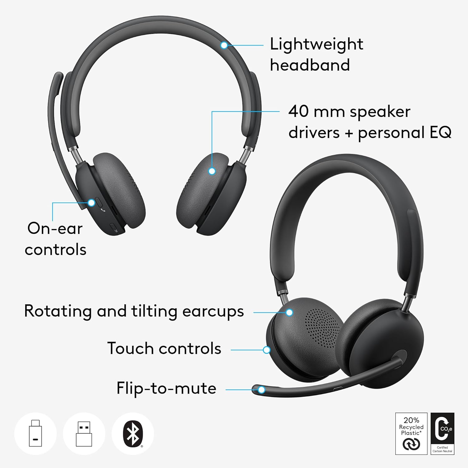 The Logitech Zone 950 is engineered for exceptional sound clarity, making it the ultimate wireless headset for professionals. Whether you're working in a busy office or a bustling café, this headset ensures you can hear and be heard with crystal-clear precision. Featuring Advanced Call Clarity powered by AI, the Zone 950 enhances the voice of your conversation partner while suppressing ambient noise. Hybrid ANC technology eliminates distracting background sounds, and noise-canceling mics amplify your voice while minimizing other noises. Enjoy premium audio with 40 mm speakers and personalize your sound with the Logi Tune app. Designed for all-day comfort and environmental responsibility, the Zone 950 boasts replaceable earpads, a long-lasting battery, and sustainable materials.