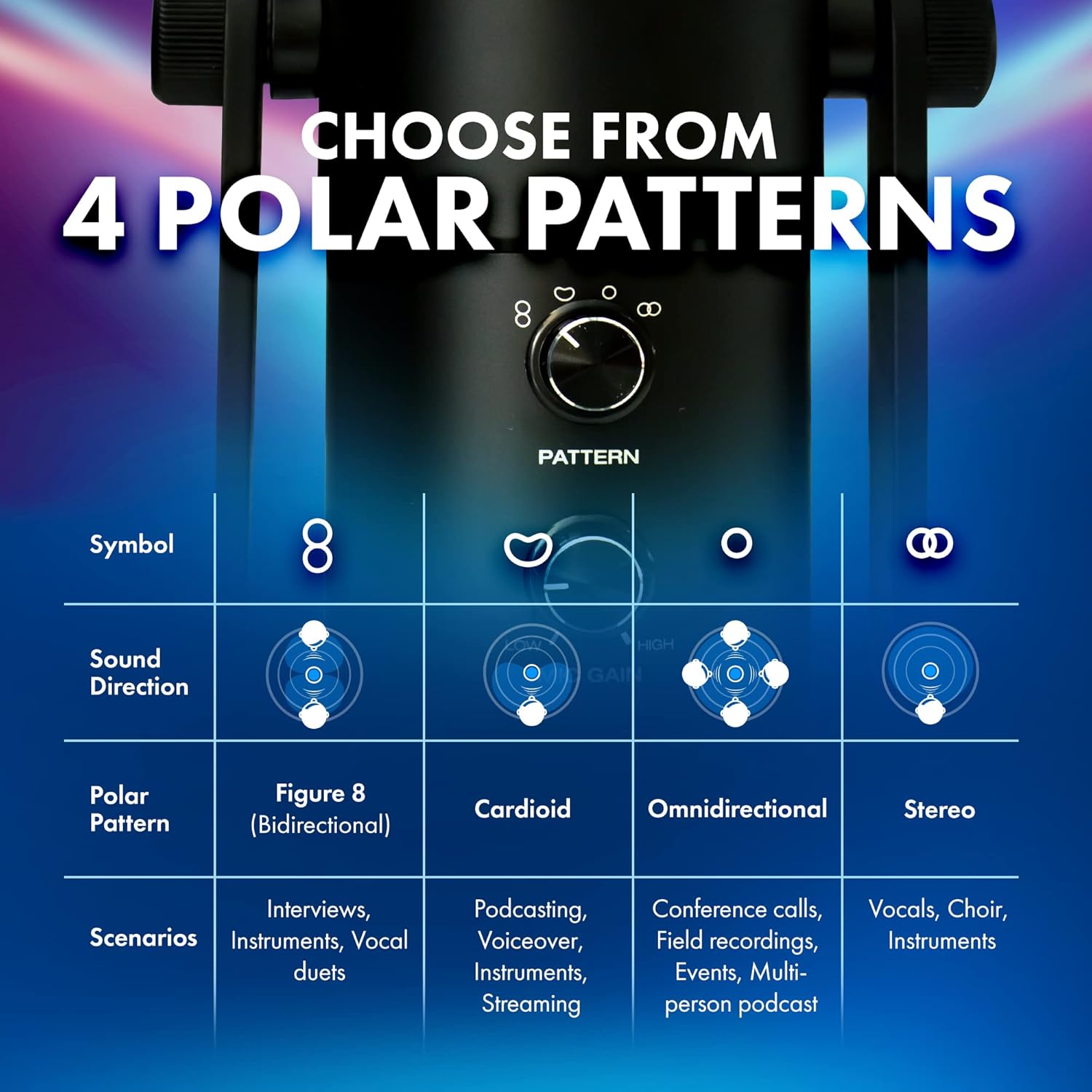 - Polar Patterns: Cardioid, Figure-8, Omnidirectional, Stereo