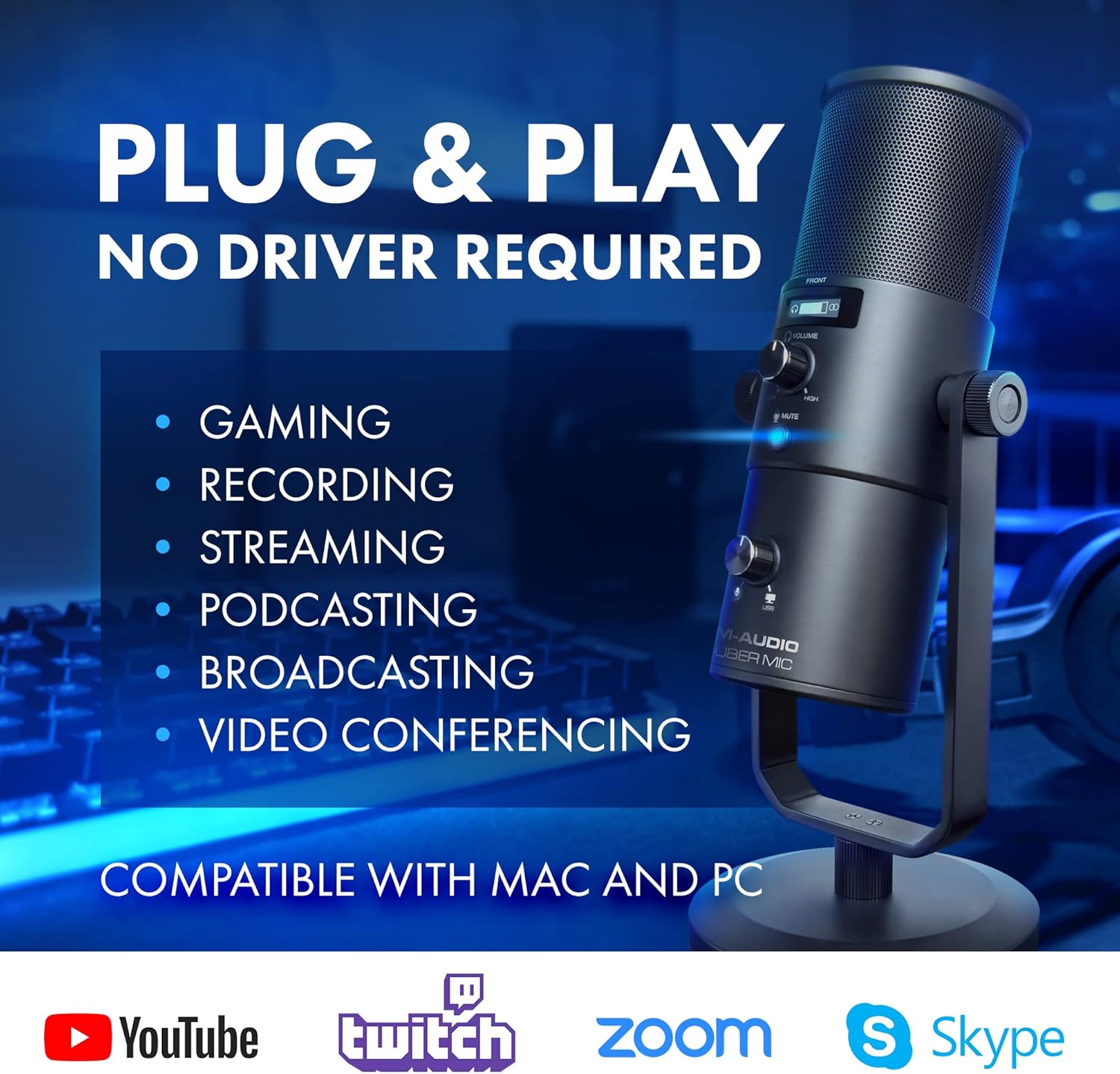Introducing the M-Audio Uber Mic. Designed for versatility, this USB microphone delivers professional-grade audio for recording, podcasting, streaming, and more.