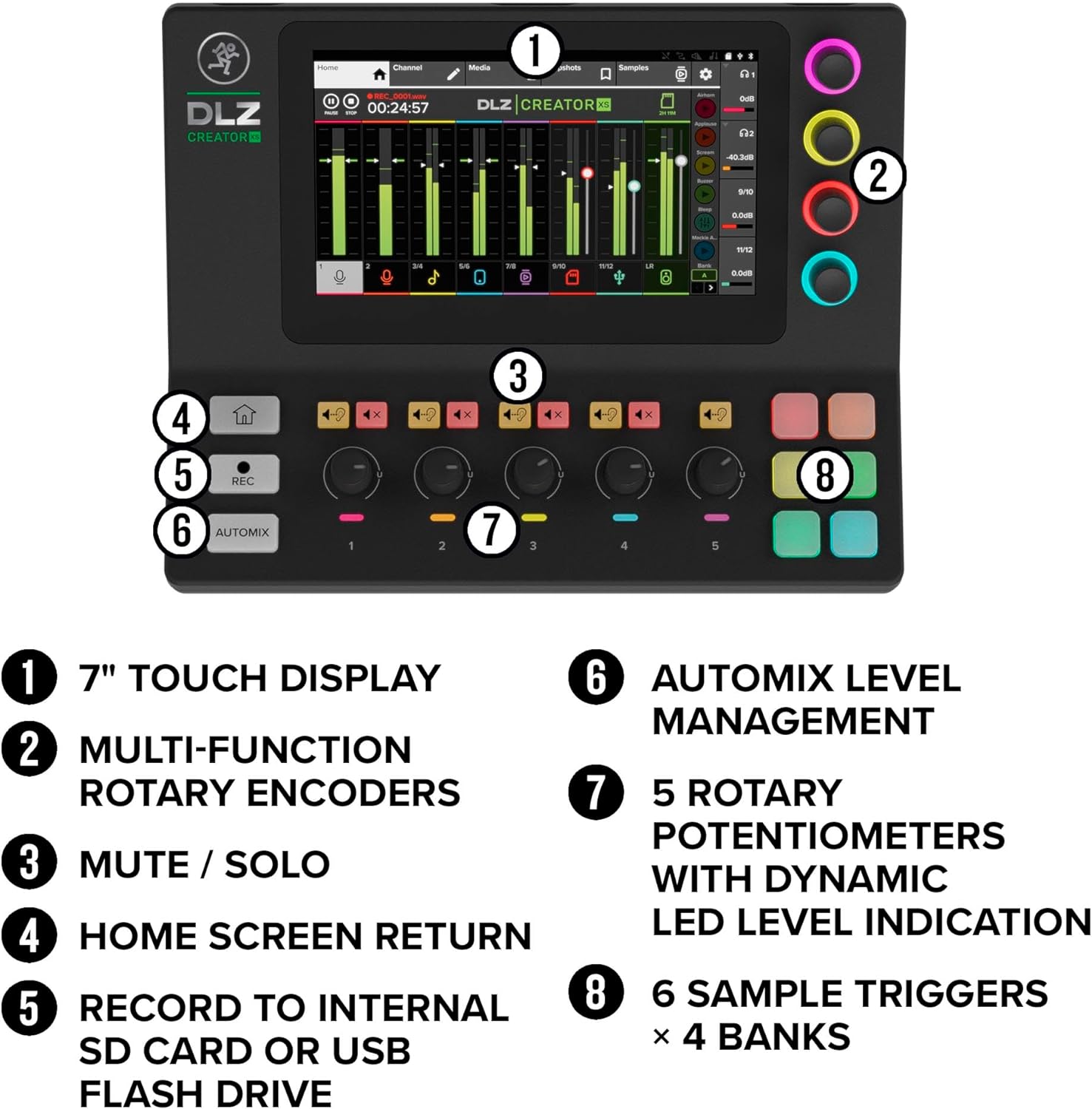 Introducing the Mackie DLZ Creator XS, a compact 6-channel digital mixer designed for podcasting and streaming. Featuring Mix Agent technology, Onyx80 mic preamps, and a user-friendly touchscreen, it delivers professional-quality audio with ease.