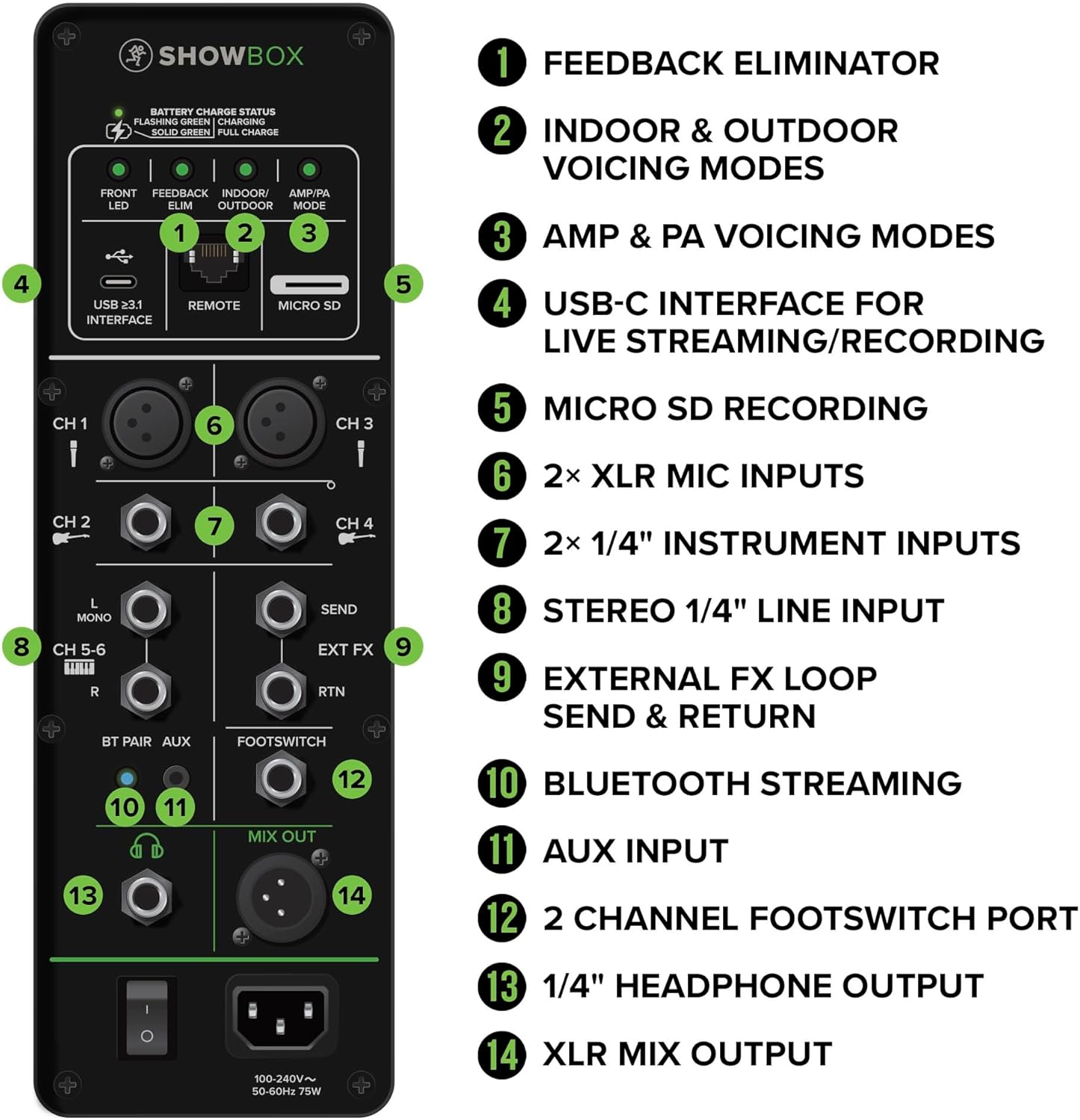 The Mackie ShowBox is the ultimate battery-powered solution for live performers. Combining a powerful amplifier, portable PA speaker, 6-channel mixer, FX unit, and audio interface with a breakaway controller, it's designed to deliver professional sound and seamless control in any setting.