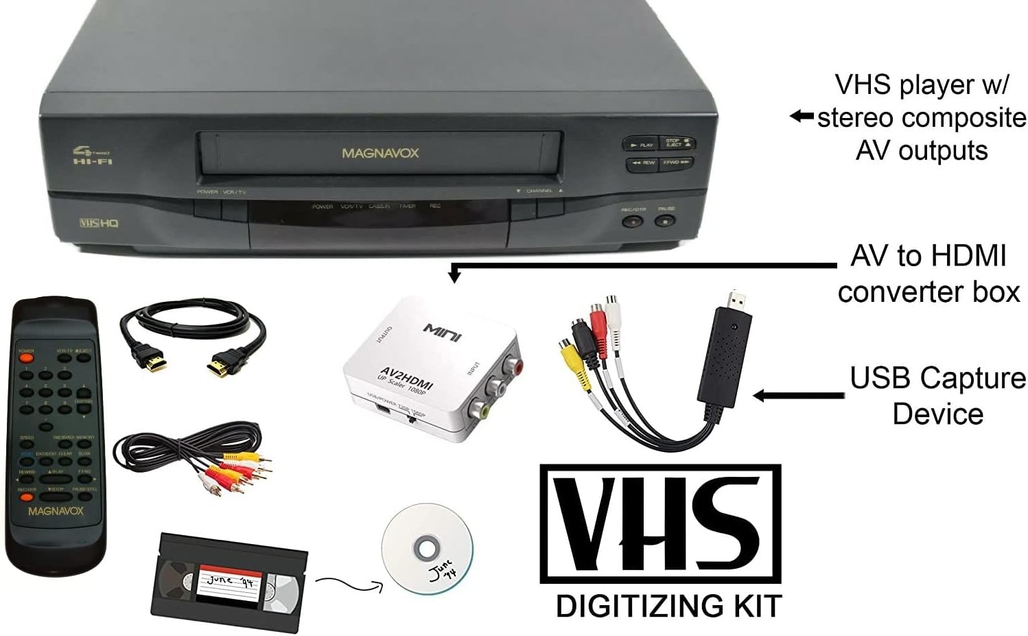 The MAGNAVOX 4-Head VCR Video Cassette Recorder offers a reliable way to watch your favorite VHS tapes. This renewed unit comes with a remote, USB adapter, and HDMI converter, providing versatile connectivity options for your modern entertainment setup.