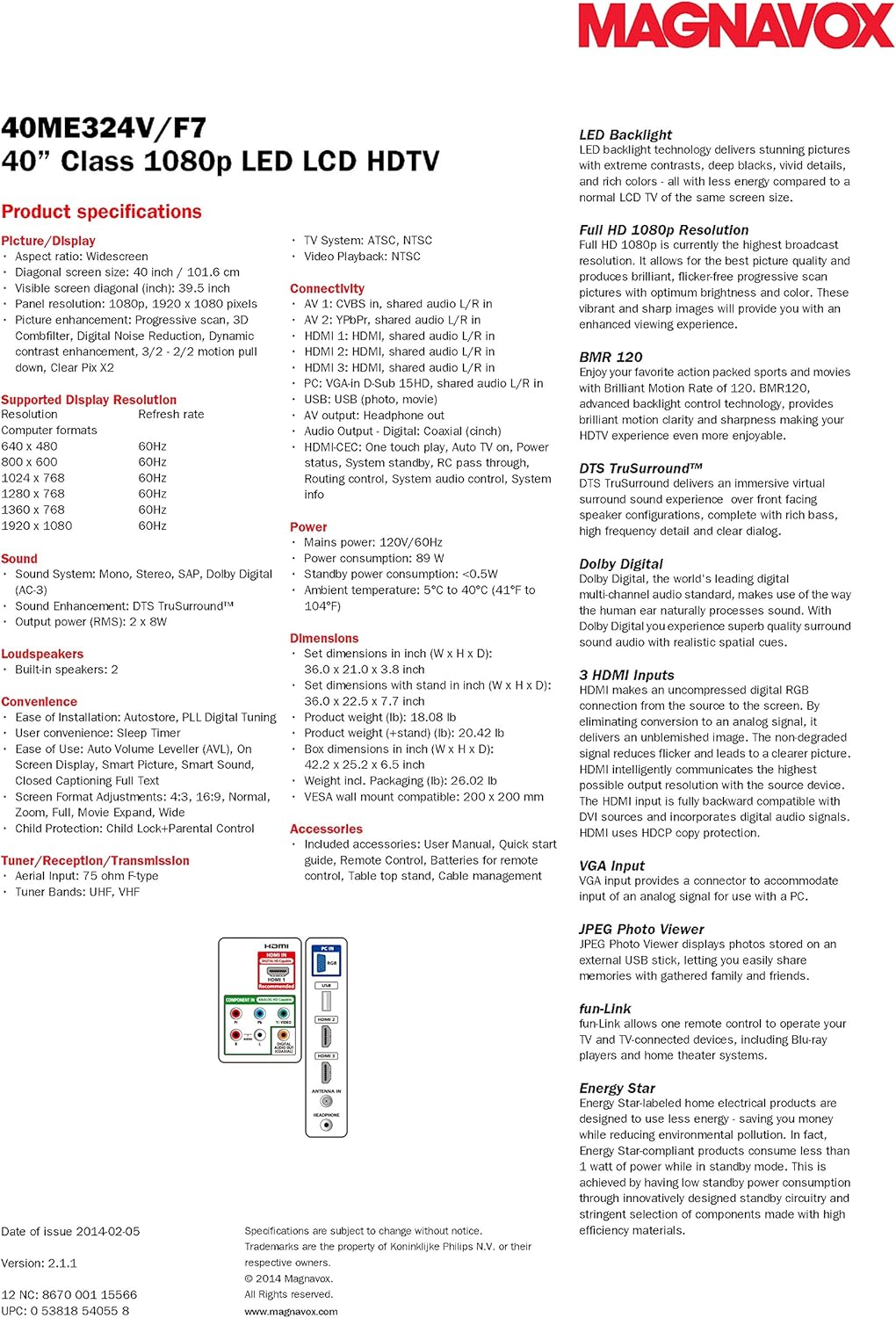 The Magnavox 40ME324V/F7 offers a great viewing experience with its 40-inch display and 1080P HD resolution. Featuring LED backlighting, DTS TruSurround audio, and multiple AV inputs, this TV delivers both superb audio and video quality.
