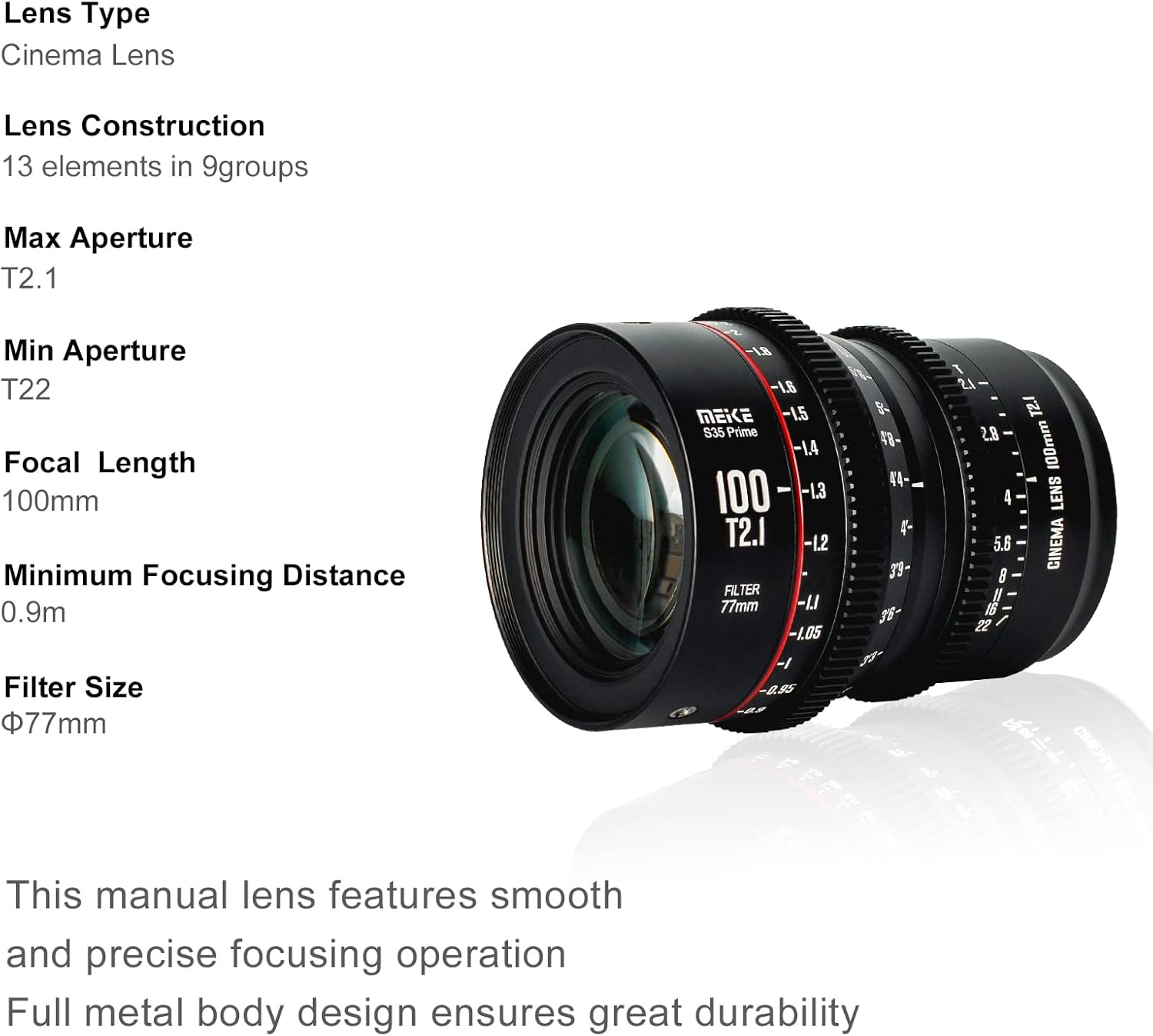 The Meike 100mm T2.1 S35 Prime Cinema Lens is designed for professional filmmakers and videographers. This manual focus lens delivers exceptional image quality, with a wide aperture of T2.1 for creating beautiful shallow depth of field effects. Compatible with Canon EF mount cameras and camcorders, it's perfect for a variety of cinematic applications.