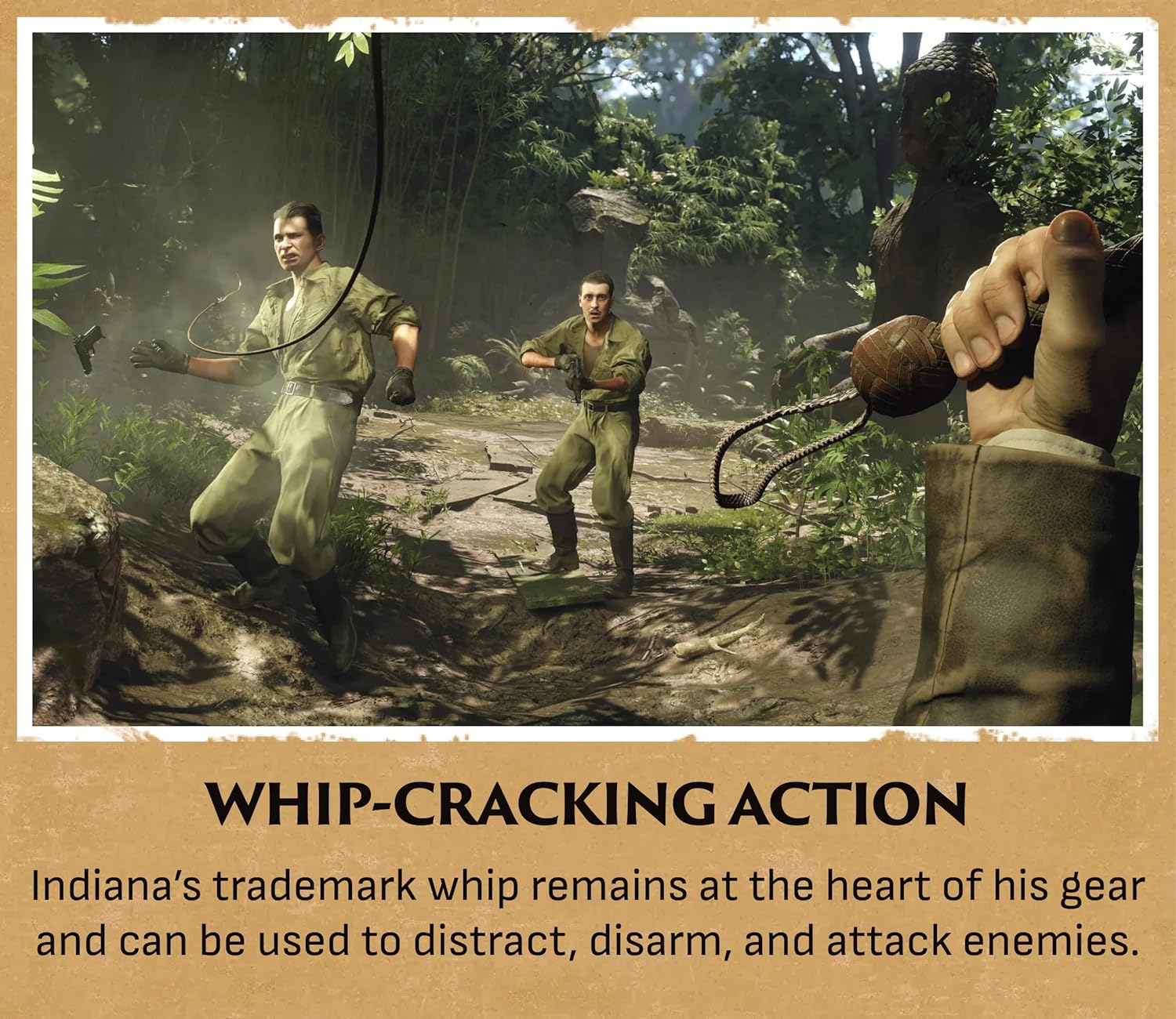 - Use Indiana's trademark whip to distract, disarm, and attack enemies