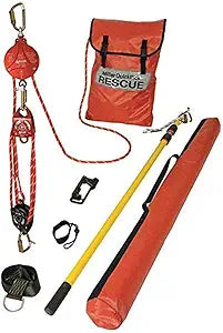 - Includes: Backup braking system, pulleys, 75 feet of rope, rescue pole with clip, pigtail rope control handle, carabineers, cross-arm anchorage connector, WristBandit Tool Lanyard, kit bag, and pole bag.