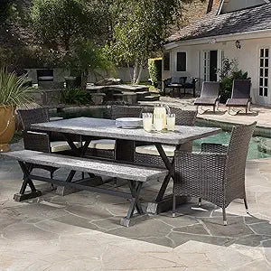 This 6-piece outdoor dining set combines modern design with rustic charm. Crafted with lightweight concrete, fabric, iron, and wicker, it offers a stylish and comfortable setting for outdoor gatherings.