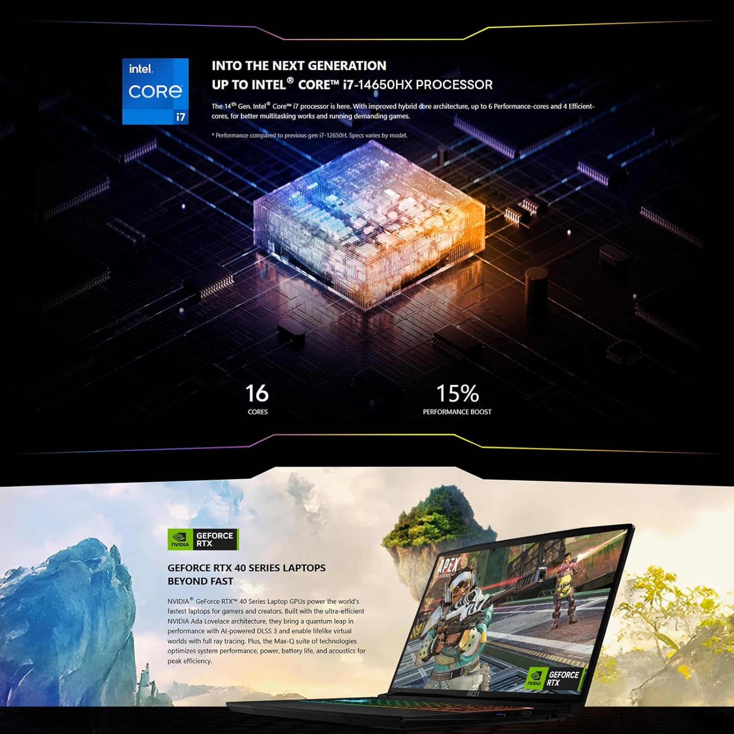 - Processor: Intel Core i7 14650HX (Up to 5.2GHz, 16 Cores, 24 Threads)