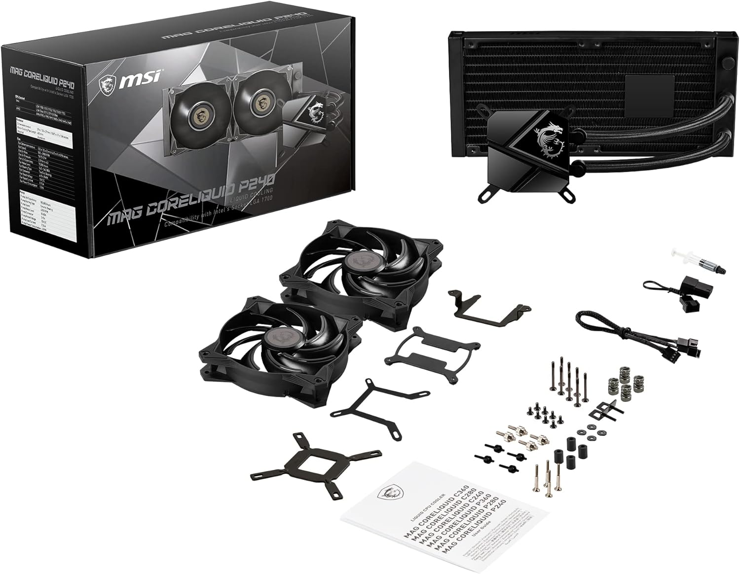 **Specifications:** * **Brand:** MSI * **Model:** MAG CORELIQUID P240 * **Type:** AIO CPU Liquid Cooler * **Radiator Size:** 240mm * **Fan Size:** 2x 120mm PWM Fans * **Fan Speed:** Up to 2000 RPM * **Noise Level:** 18 dB * **Air Flow:** 78.73 CFM * **Socket Compatibility:** AMD AM5, AM4, FM2+, FM2, FM1, AM3+, AM3, AM2+, AM2; Intel LGA 1150, 1151, 1155, 1156, 1700, 1200, 1366, 2011, 2011-3, 2066 * **Tubing Length:** 400mm * **Power Connector:** 4-Pin * **Voltage:** 12V * **Wattage:** 260W * **Dimensions:** 10.71"L x 1.06"W x 4.72"HWe partner with Amazon and other retailers to provide accurate product information and convenient access to purchase options. As an Amazon Associate we earn from qualifying purchases.
