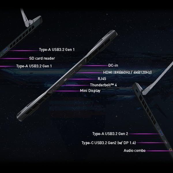 - Ports & Slots: 1 x HDMI, 1 x RJ45, 3 x USB-A 3.2, 1 x USB-C 3.2, 1 x Thunderbolt 4, 1x SD Card Reader, 1 x Headphone/Microphone Combo