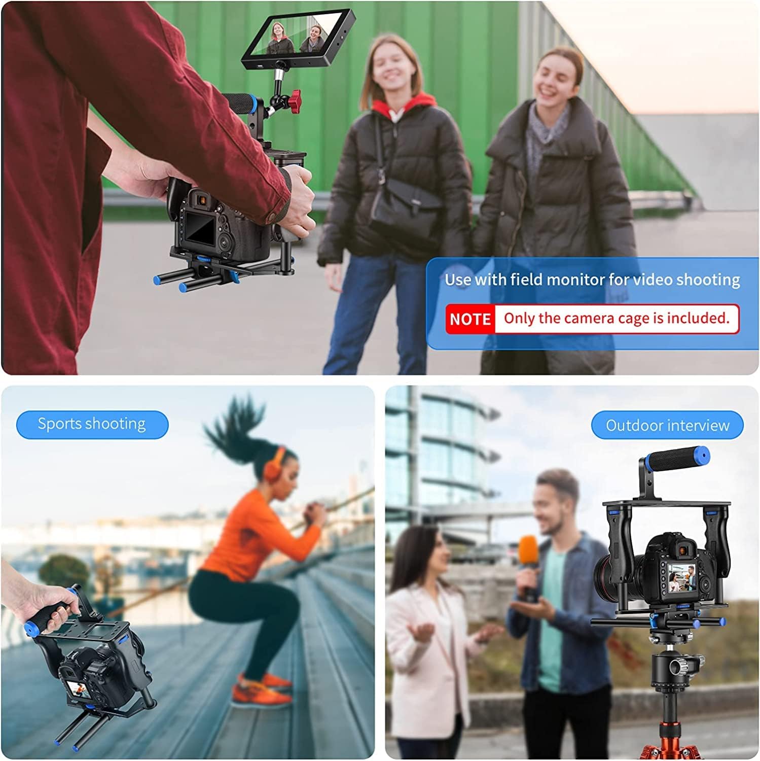 The NEEWER Camera Video Cage Film Movie Making Kit is designed to provide stability and versatility for DSLR and camcorder users. This kit includes a cage, top handle, dual hand grip, and 15mm rods, allowing you to create professional-quality videos with ease.