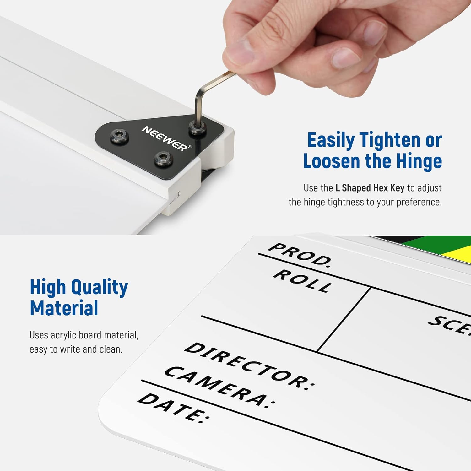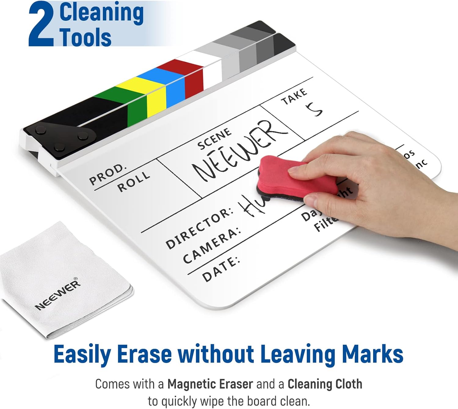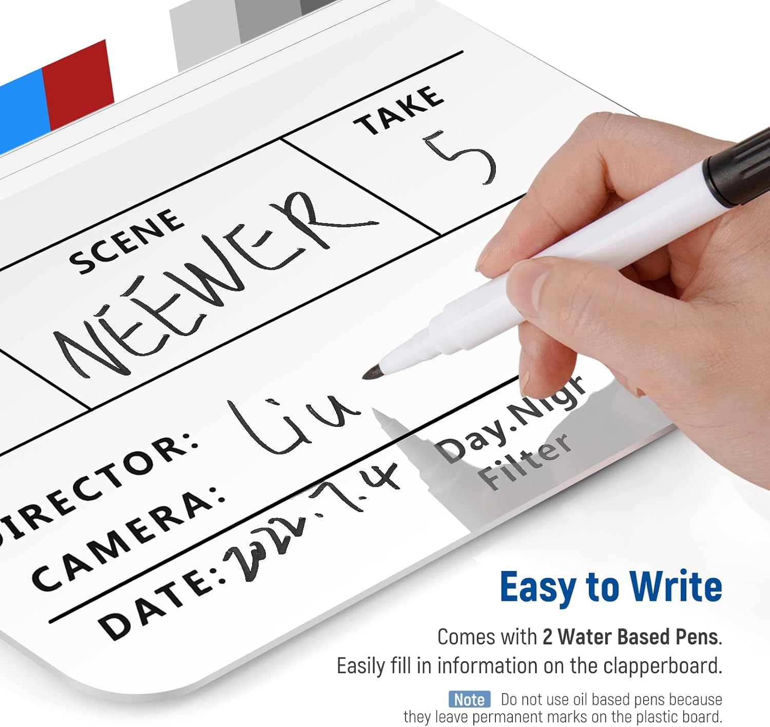 Introducing the Neewer Acrylic Film Movie Directors Clapper Board Kit. This essential filmmaking tool helps you synchronize audio and video with professional precision. Clearly mark each take and scene for efficient editing, perfect for any aspiring or seasoned filmmaker.