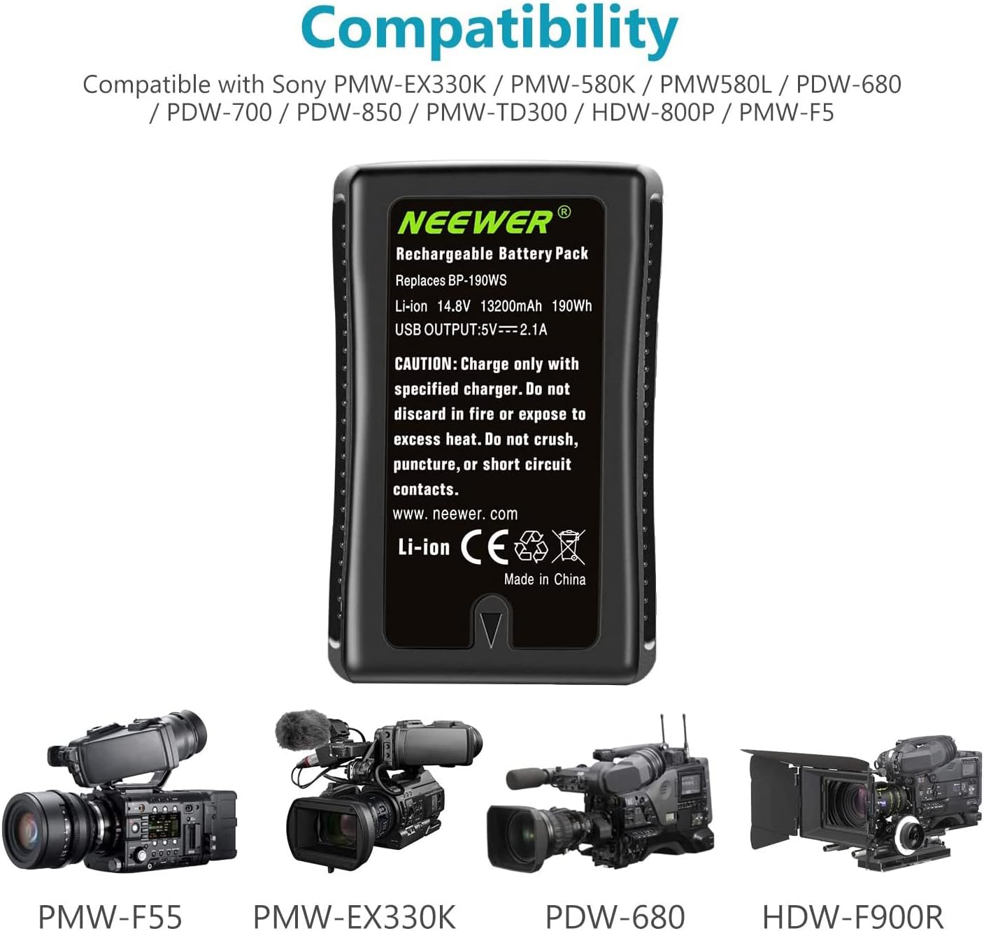 Introducing the Neewer V Mount/V Lock Battery, a dependable power source designed for professional camcorders and broadcast equipment. This rechargeable Li-ion battery delivers 190Wh at 14.8V, ensuring extended operation for your Sony HDCAM, XDCAM, digital cinema cameras, and other compatible camcorders. Equipped with multiple interfaces and a robust design, this battery is an essential tool for on-location shoots and studio environments alike.