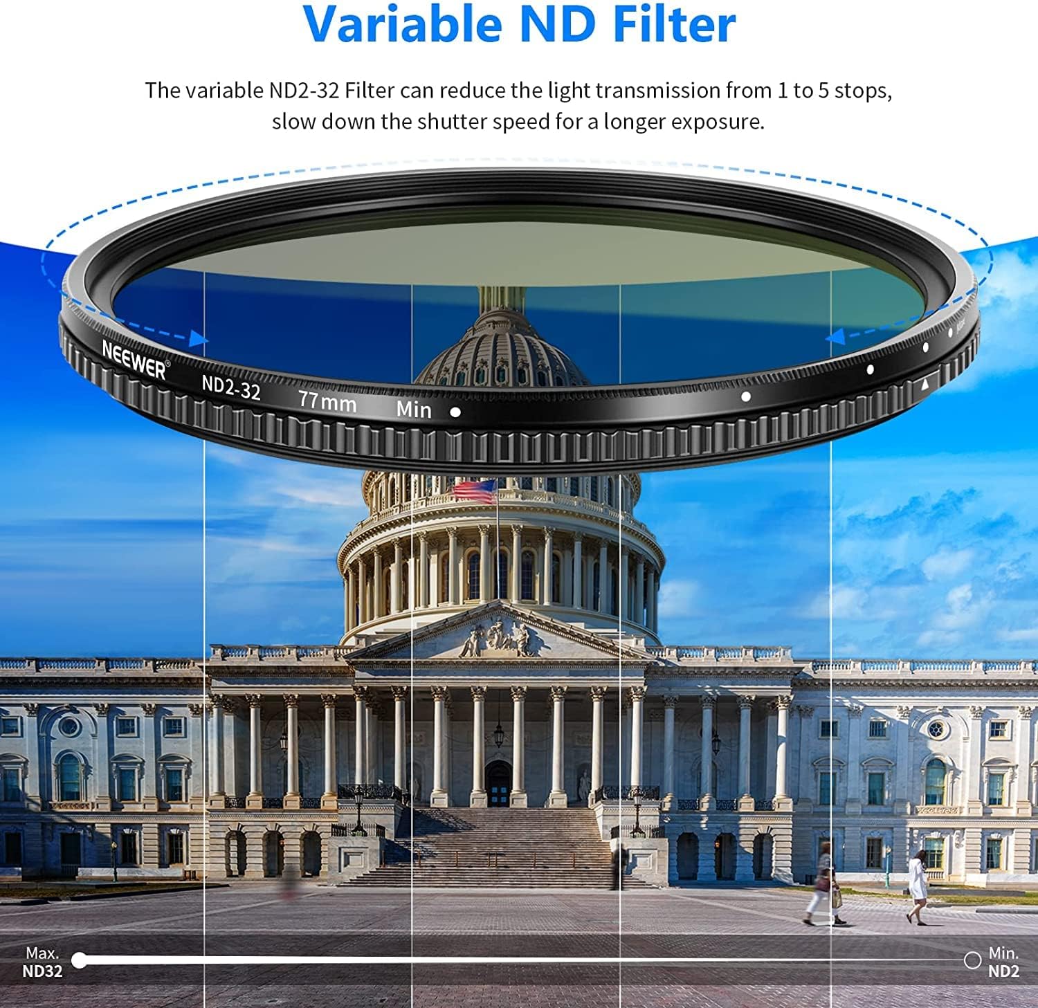 The Neewer 77mm Variable Fader ND Filter, allows you to control light and create stunning effects. Eliminating black cross issues and featuring multilayer coatings, this filter ensures exceptional image quality and durability. Perfect for photographers seeking versatile and reliable neutral density control.
