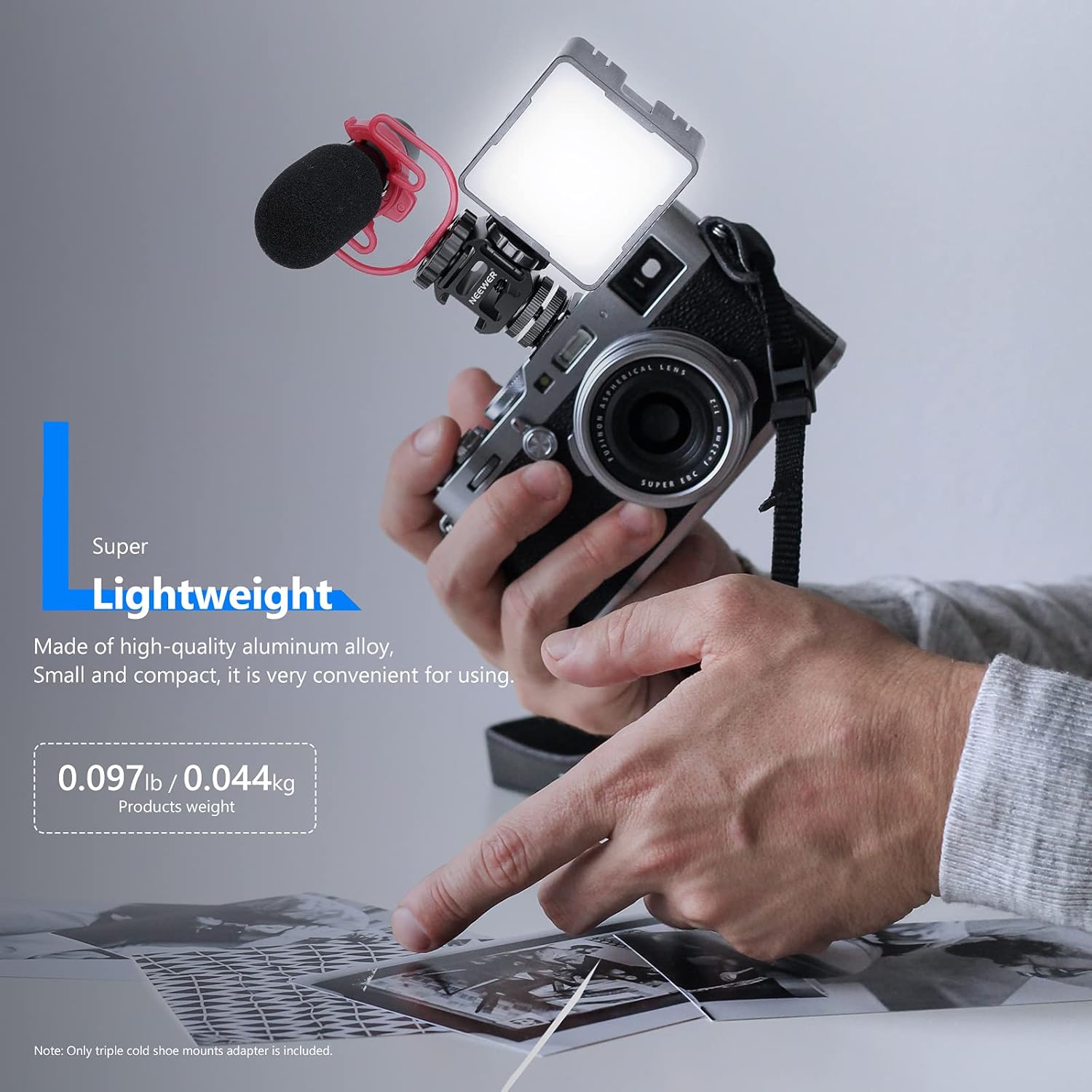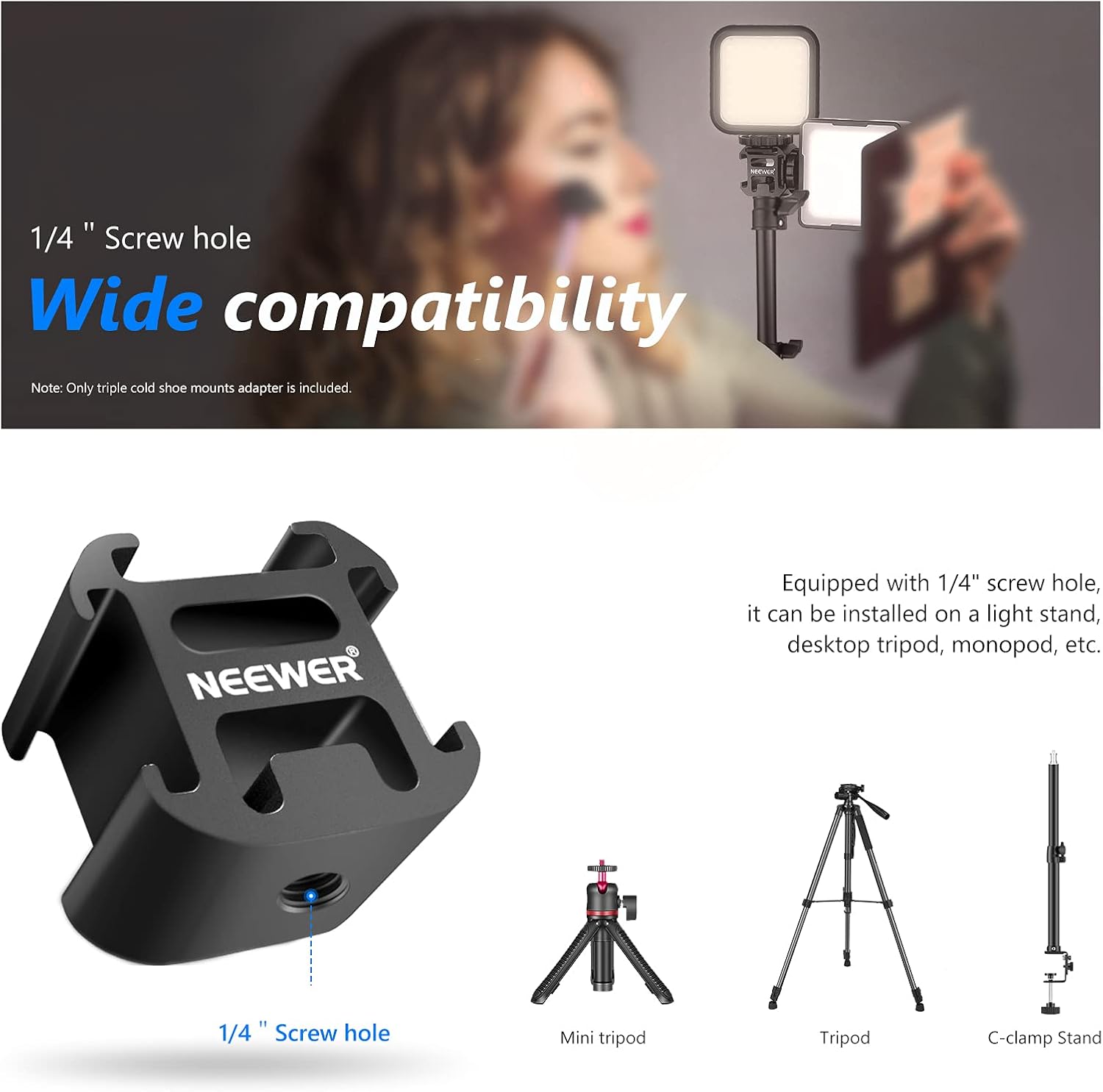The NEEWER Camera Hot Shoe Mount Adapter allows you to easily attach multiple accessories to your camera, camcorder, or smartphone. Featuring three cold shoe mounts, it's perfect for adding microphones, LED video lights, and field monitors to enhance your video and photo shooting. Its durable aluminum-alloy construction ensures reliability in any weather, while the lightweight design makes it ideal for on-the-go creators. The 1/4"-20 socket provides compatibility with tripods, monopods, and stabilizers for added versatility.