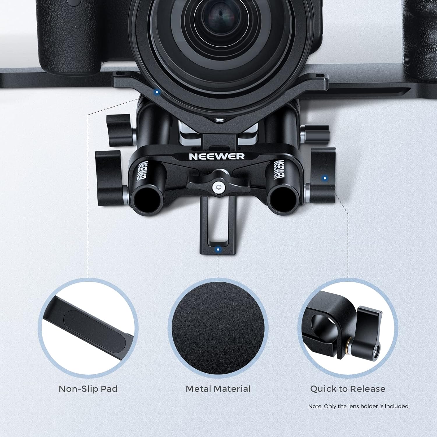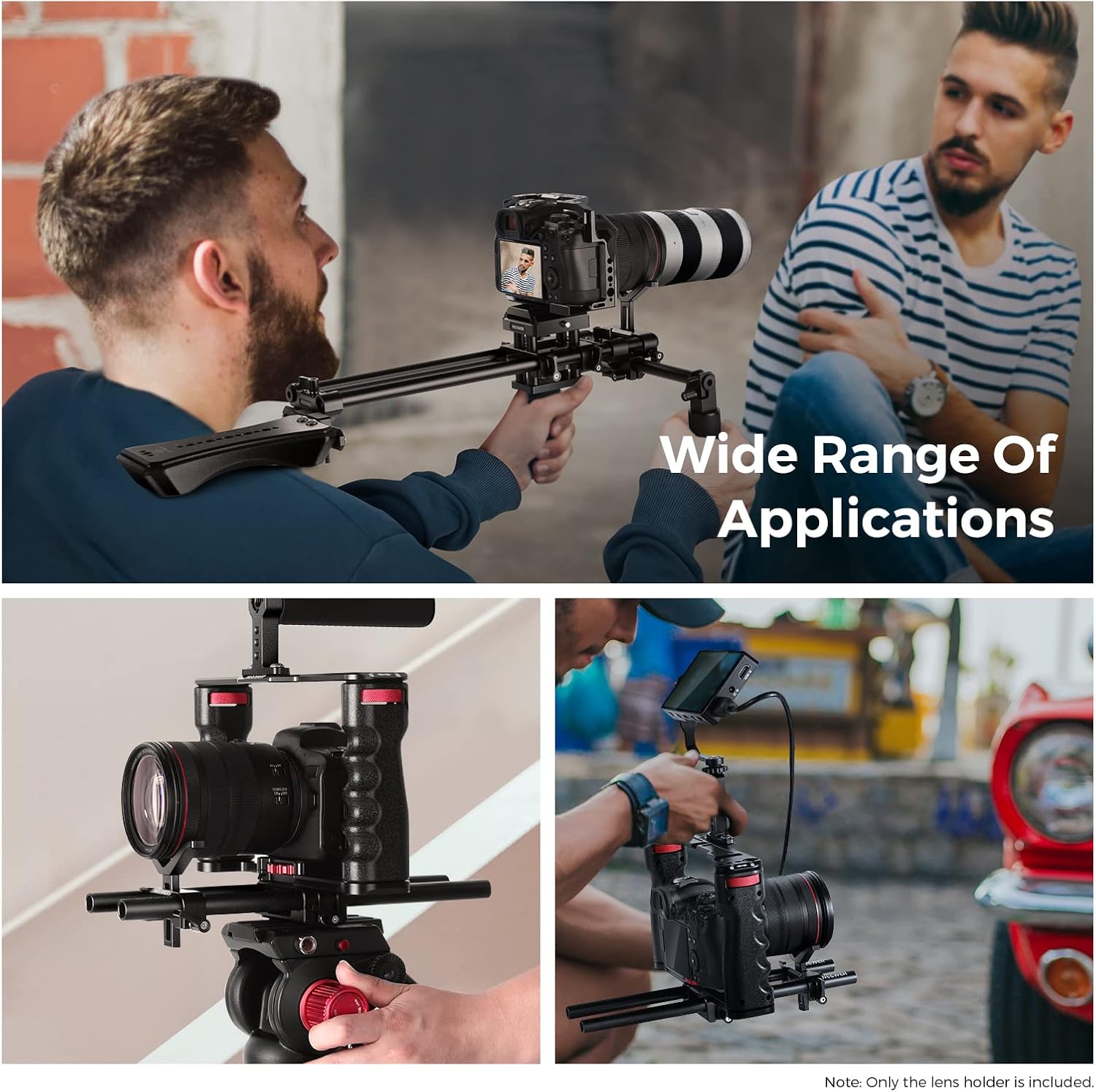 The Neewer Telephoto Long Lens Support Bracket provides stable support for telephoto lenses when used with a DSLR camera shoulder rig. The Y-shaped bracket and adjustable height ensure optimal balance and reduced vibration for sharper photos and videos.