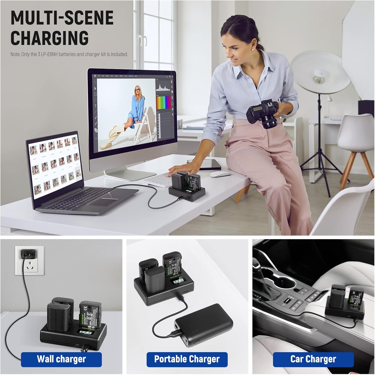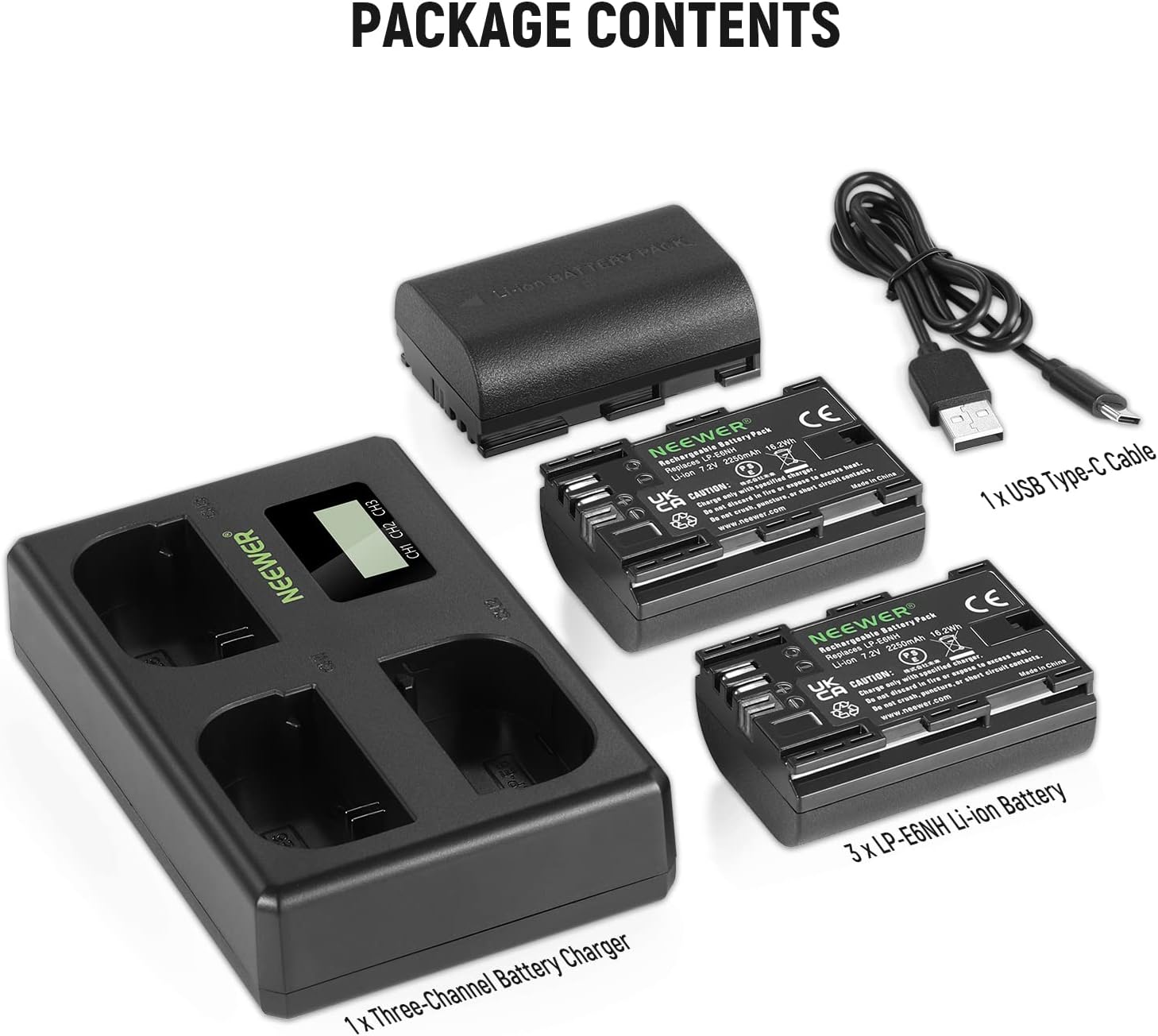 The Neewer LP-E6NH Replacement Battery and USB Charger Set provides a reliable power solution for your Canon camera. With three high-capacity batteries and a convenient triple-slot charger, you'll never miss a shot.