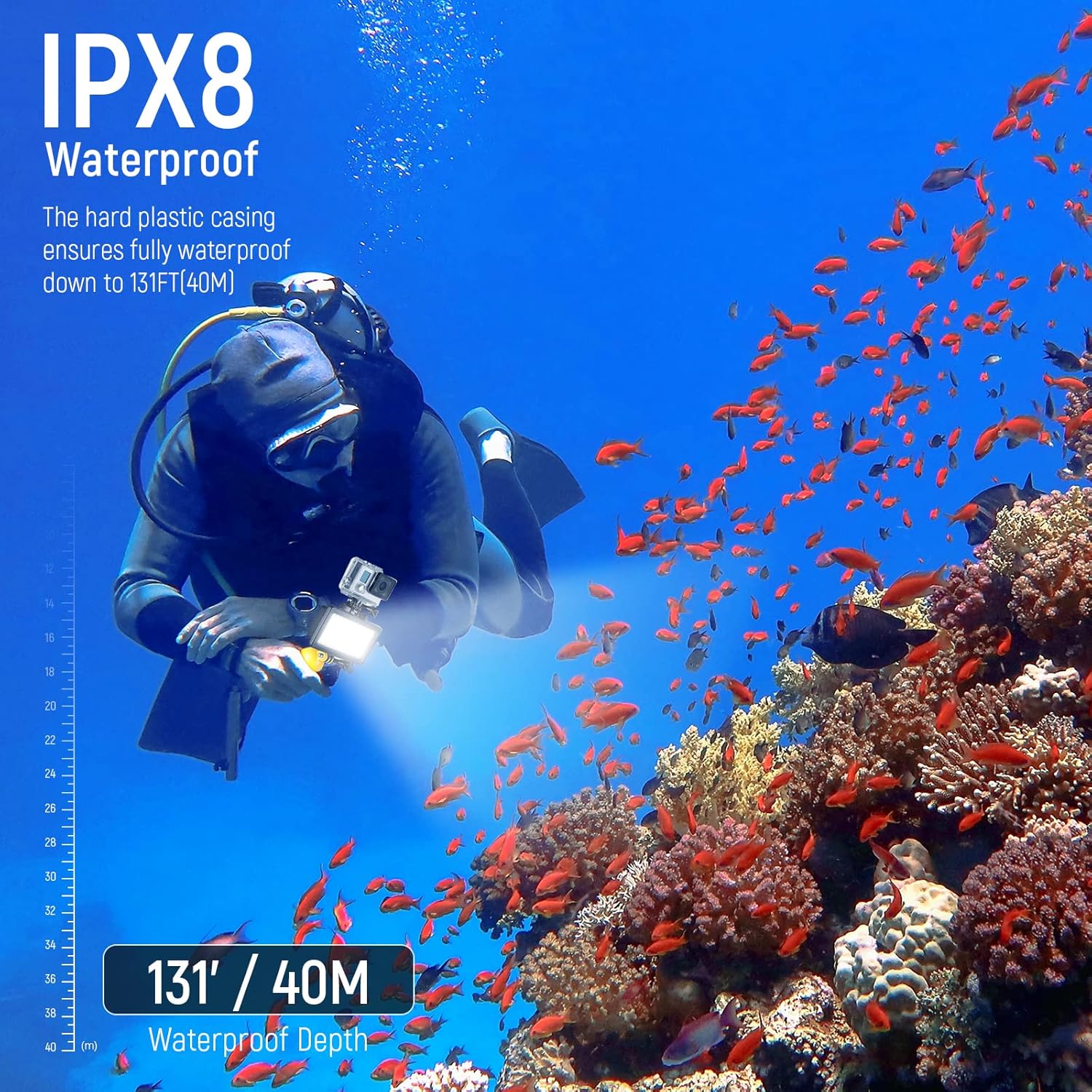 - Waterproof Depth: 131ft (40m)
